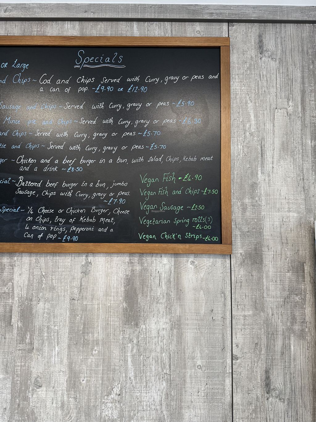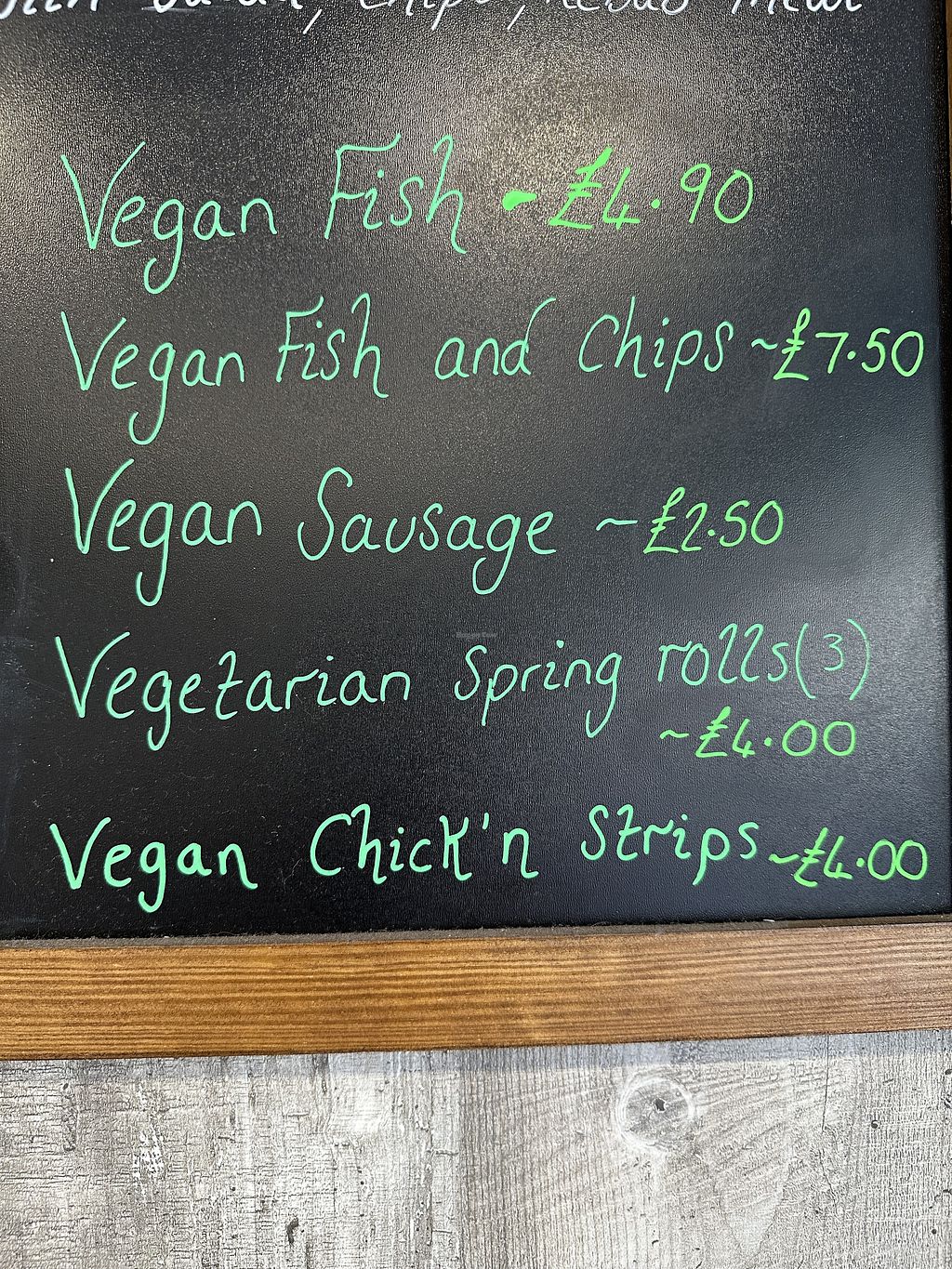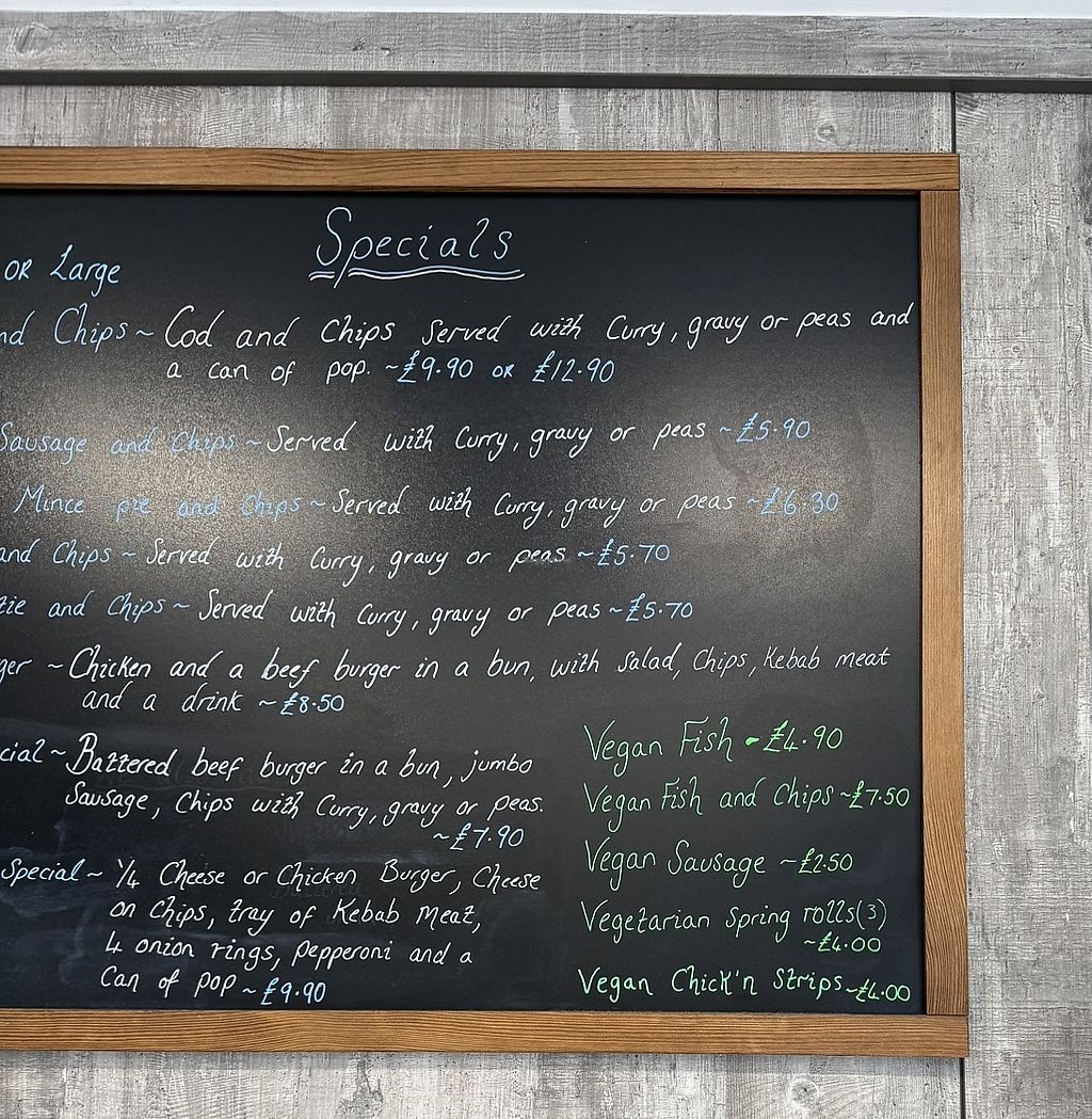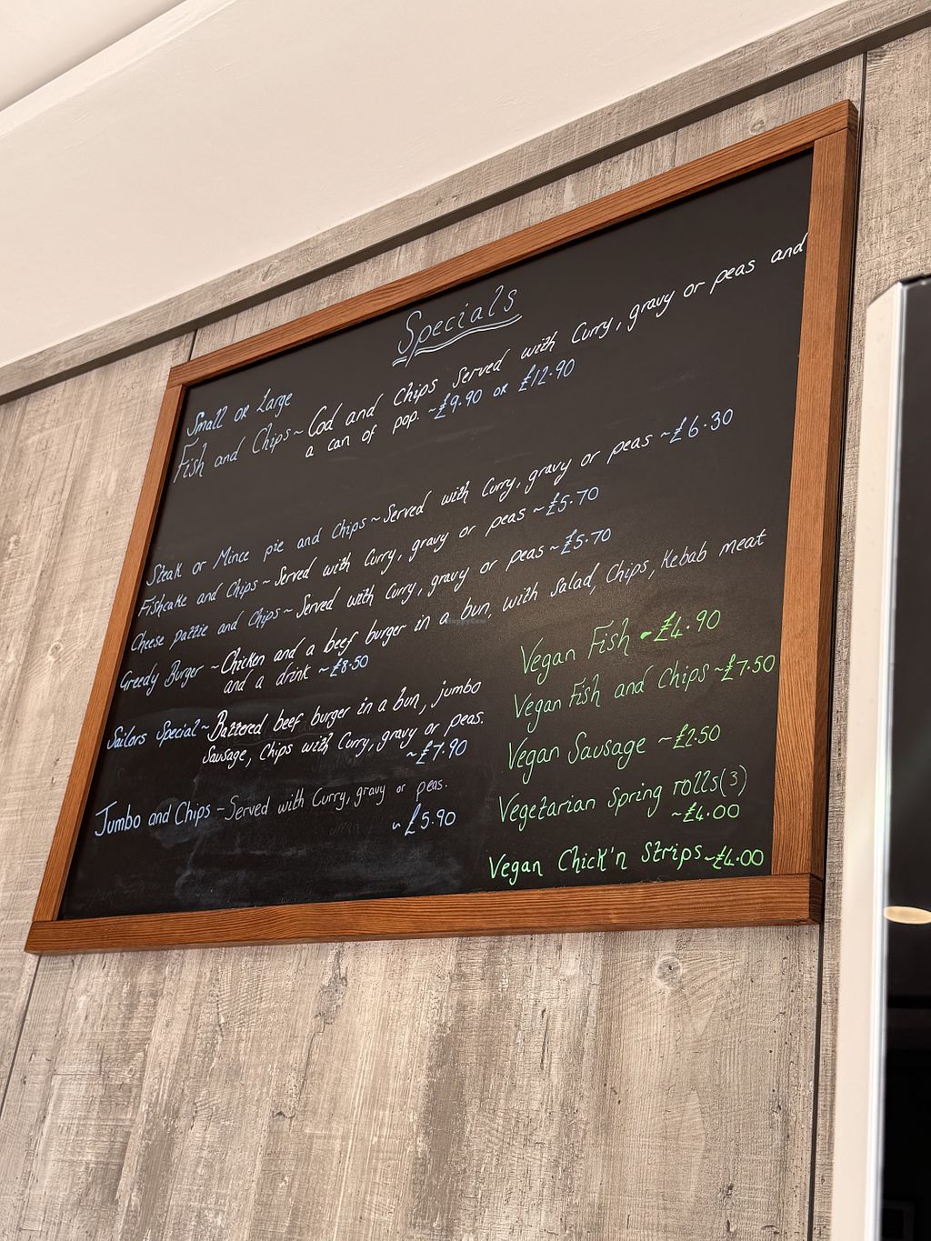 Warm welcome and very clean. The vegan options were clearly written up on the blackboard. We were very excited to have several options and went for fish and chips and sausages and chips, battered. We sat in because the heavens opened just as we ordered, and the lovely smiling lady took excellent care of us. The food was absolutely delicious, and really fresh. Would highly recommend, and will definitely return ourselves.