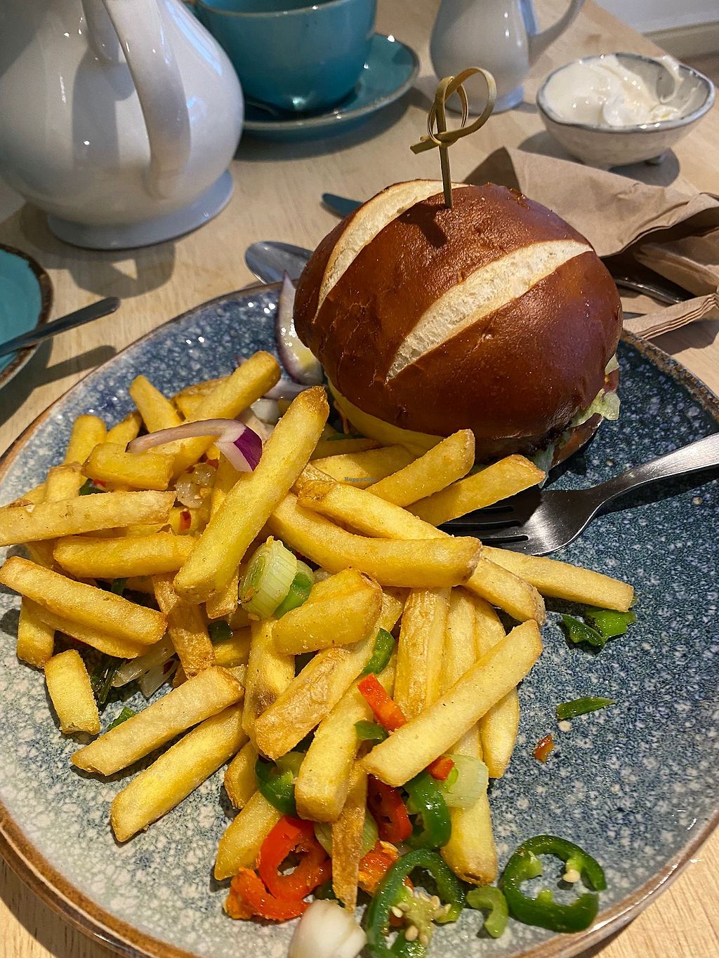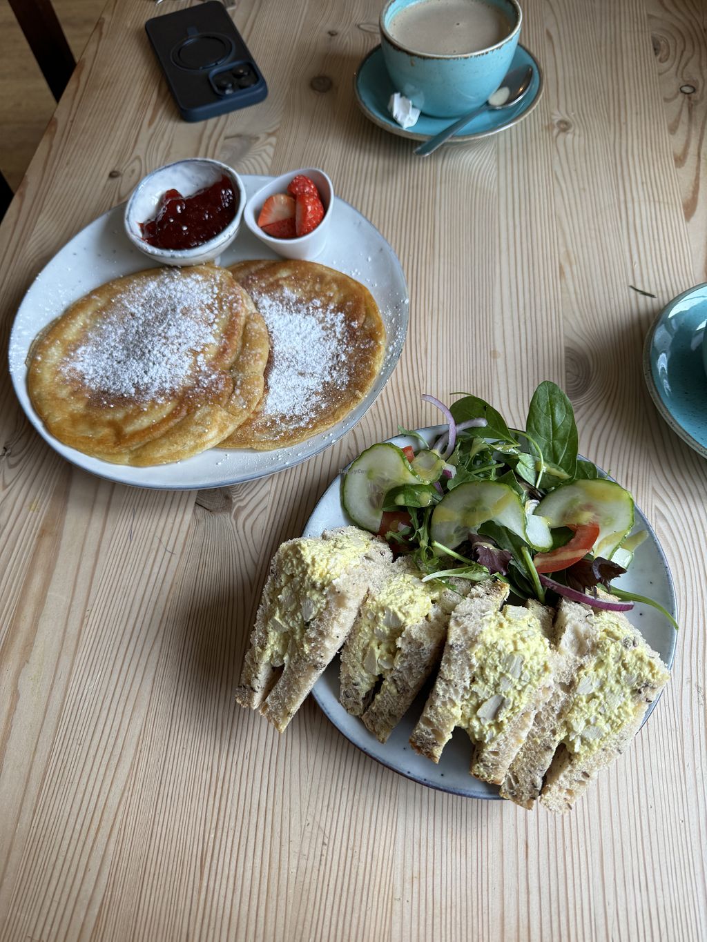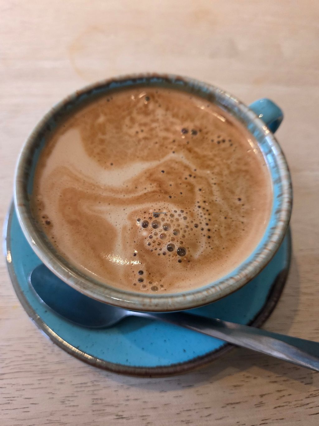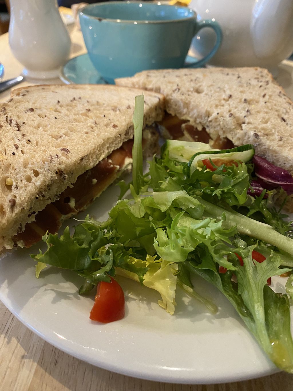 Hummus and salad sandwich with a chai latte ☕️🥗🥪