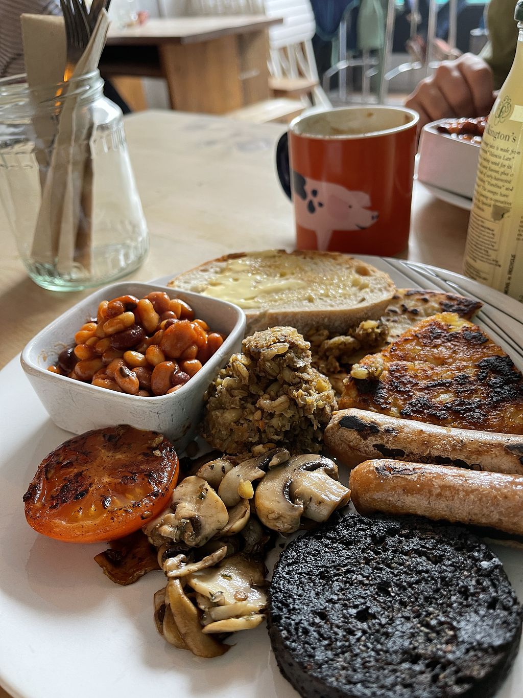Schottisches Frühstück mit Blackpudding, Haggis, Pilzen, Kartoffelscon…
