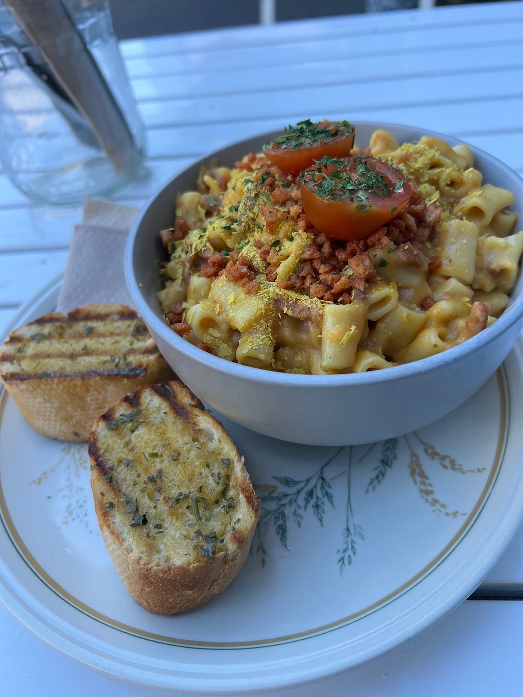 Vegan Mac & cheese with bacon bits and garlic bread yummy!