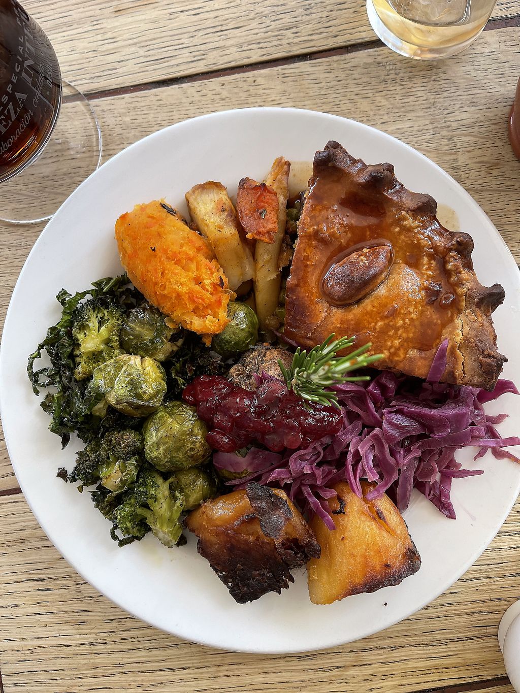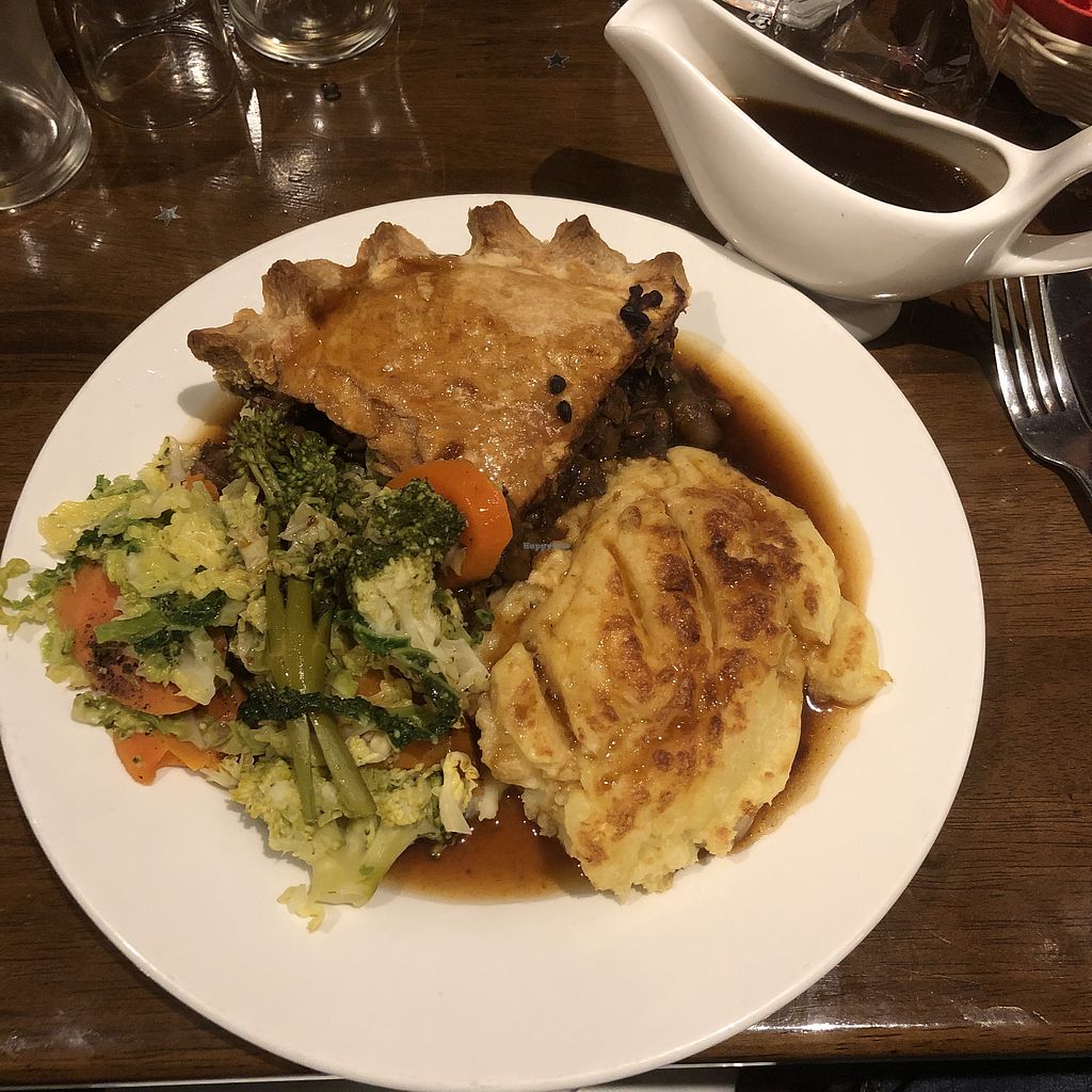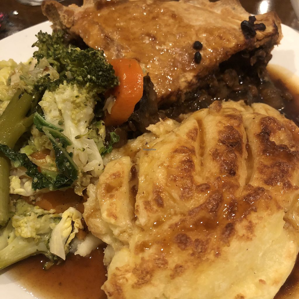 Incredible mushroom, lentil, and ale pie, with cheesy mash, veg, and g…
