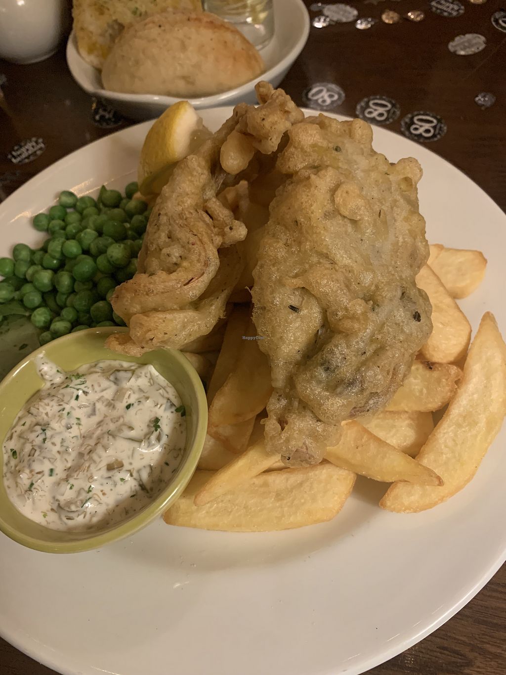Banana blossom fish & chips with mushy peas