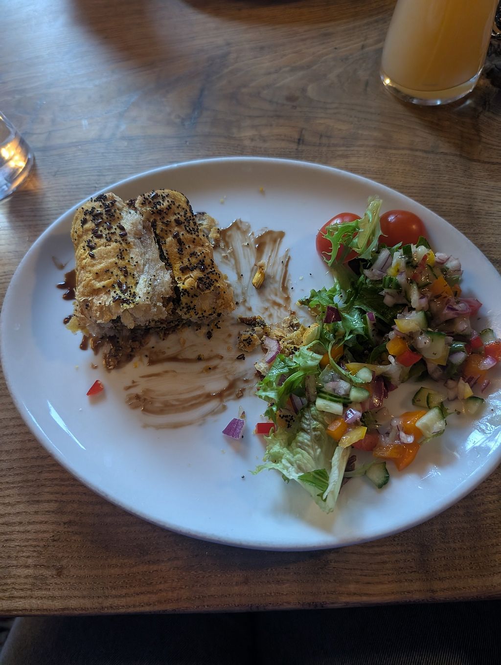 There was a separate “Vegetarian and Vegan Christmas Menu” with loads of options for vegans- you had to fill out an order form and denote you’re vegan as well as put the things you want. It was amazing to arrive to a bread basket that contained vegan bread rolls and be provided with a seperate personal pot of soya butter (this was seperate from the dairy butter for the rest of the table- I was the only vegan)! My starter was tempura veg which was average but crispy and hearty, my main was nut roast and OMG it was incredible their roast potatoes are the bomb.com, dessert was vegan lavender cheesecake very strong of lavender like pillow spray but had amazing texture and it grew on you- the best part was that after the meal there was complimentary mince pies and cream, I was shocked when I was provided with a vegan friendly mince pie seperate from the rest and my own mini jug of vegan soya cream! Usually places don’t bother to veganise the complimentary extras like chocolates, mince pies, biscuits etc. but Golden Heart did and I’m very thankful for that it added to the experience and ambiance of the night and made me feel normal for once haha! Staff were also super kind and I have no idea what the dog thing the previous reviewer was on about is- there were no dogs and tbh I wouldn’t care if there was, I’m vegan I love animals that’s the whole point!