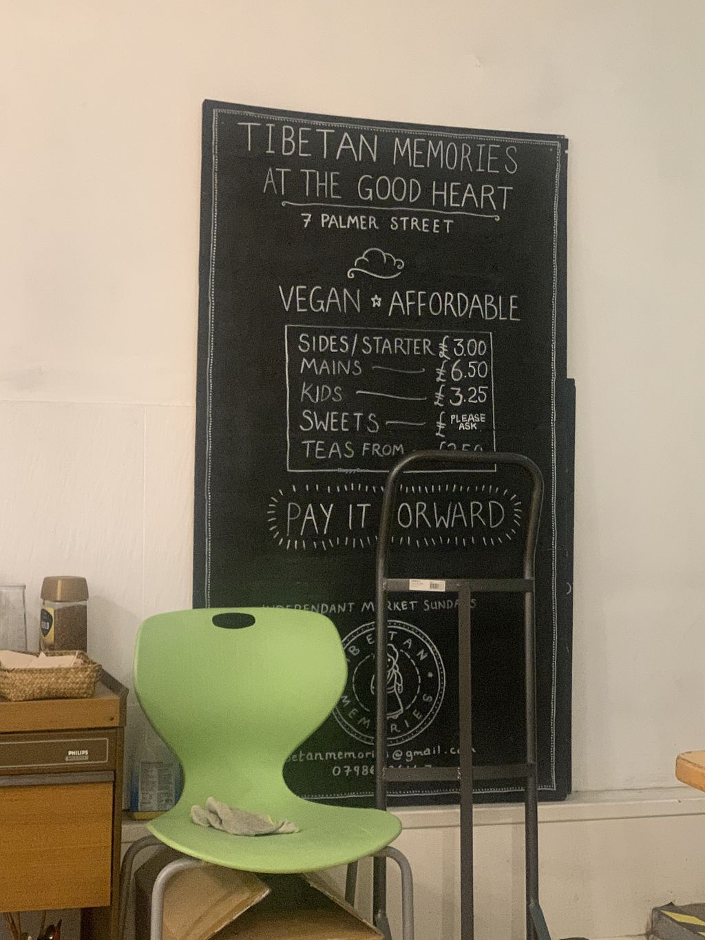 Tibetan cafe making momos and other dishes like chickpeas in spinach sauce, rice and dahl, raw carrot & beetroot salad, and greens with sichuan peppers. Beverage selection includes tea, coffee, spiced apple juice. No longer offering dairy milk as of 2020. Reported closed April 2024.