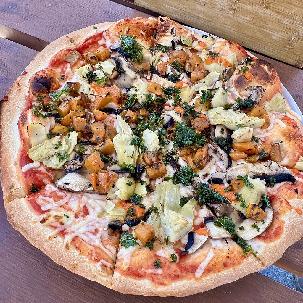 Large open space, with plenty of outdoor seating. There is only one vegan pizza, and it’s quite good. Also some share plates of such things as tapas. Therefore, limited vegan options, but what is available is quite good.
