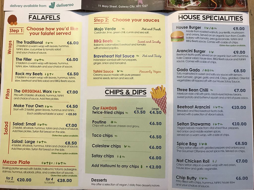 We got "The Original Worx" falafel and it was awesome! It was very filling with tons of veggies and you can choose the sauce. Food is for take away, and I suggest a lot of napkins!