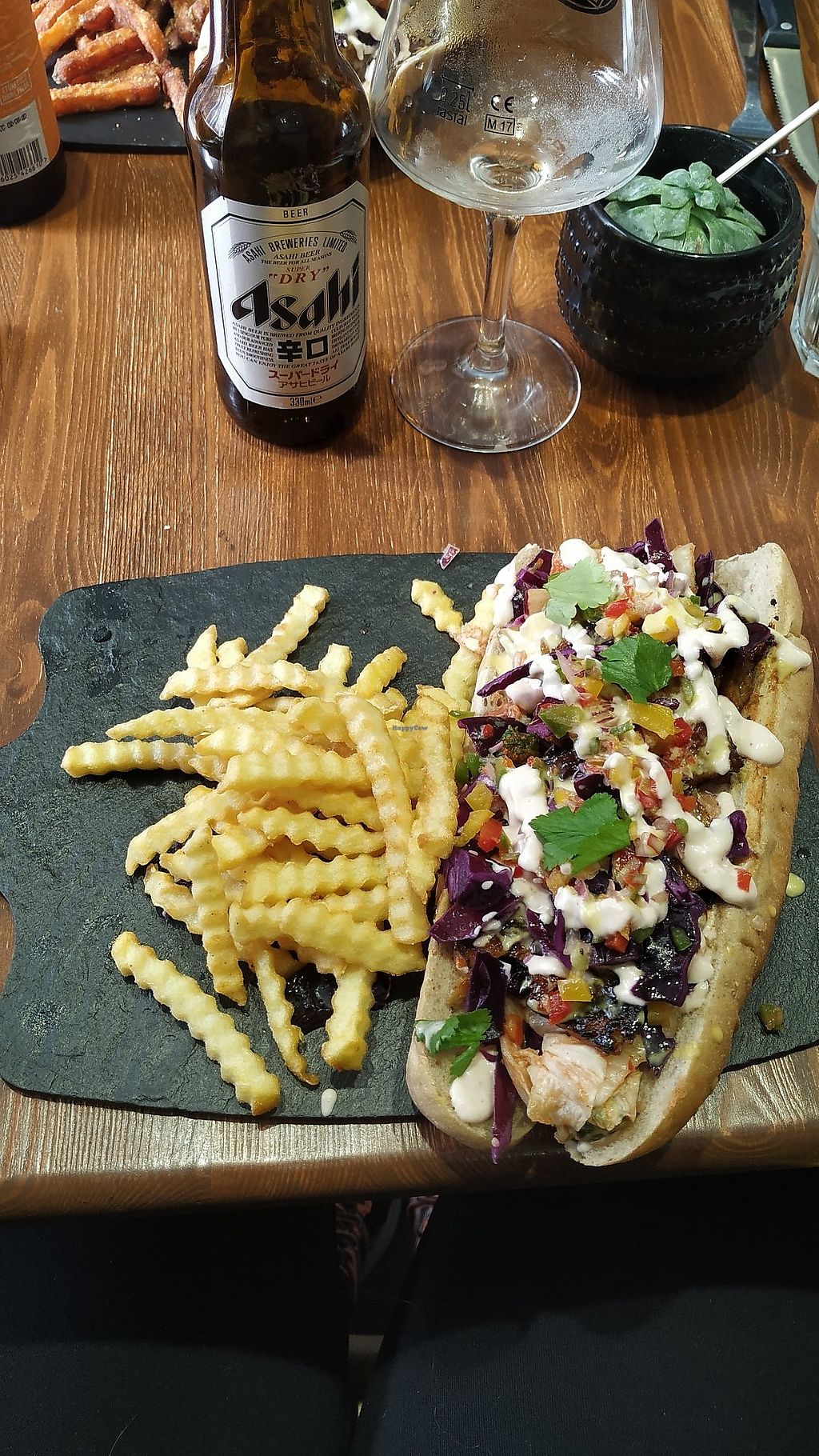 Great vegan hot dog with an Asahi beer. The staff is very nice and exp…