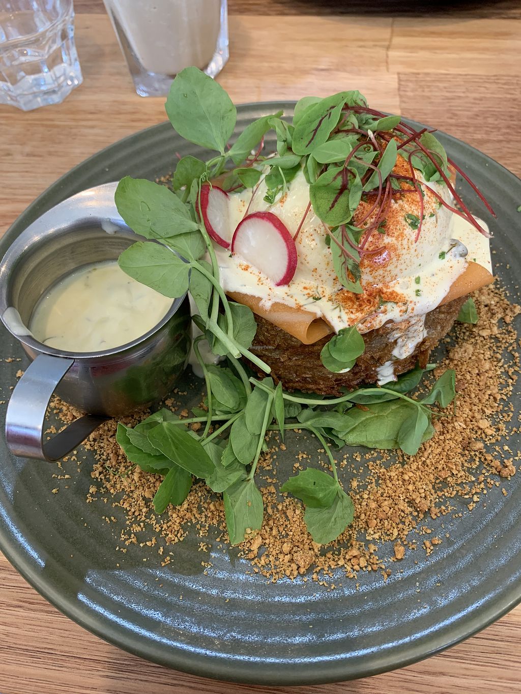 My partner had the smoked salmon rosti stack and it was also incredible. It came with a house made potato rosti topped with a vegan poached egg, vegan salmon and caper and dill sauce - mouthwatering!