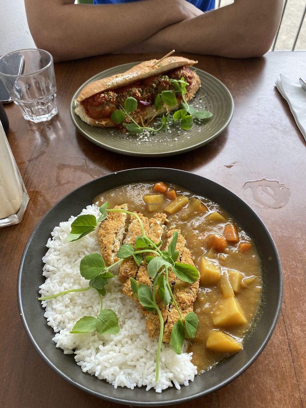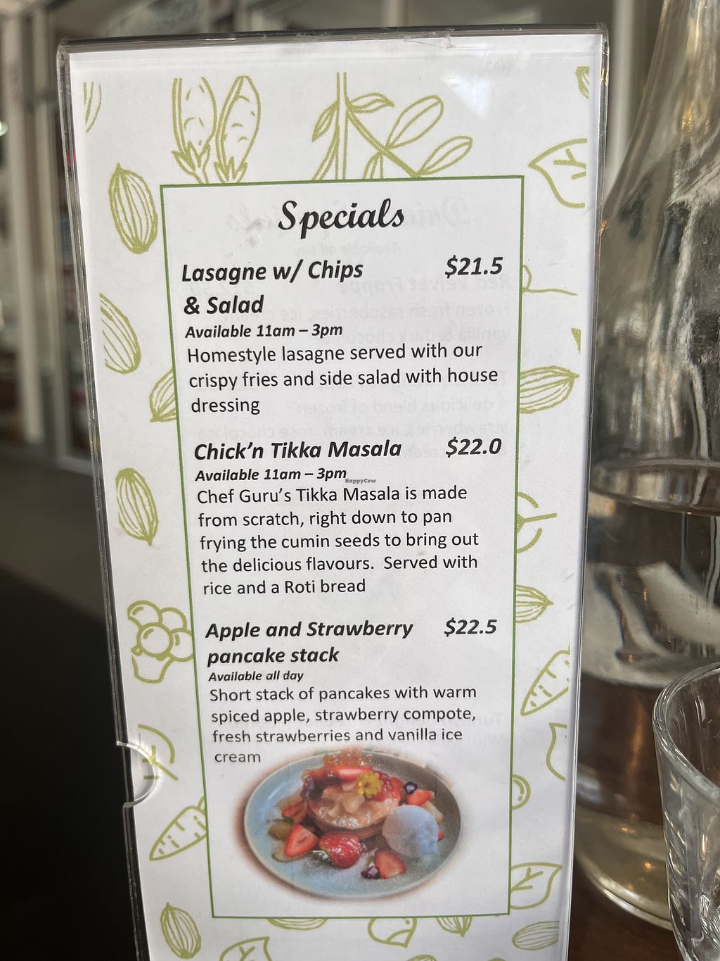 Read moreThe café has seating outside and, a few steps away, indoors. Breakfast menu until 11:00 am; drinks until 3:00 pm; lunch menu 11:00 am to 3:00 pm. There are beverages (shakes, coffees, teas, frappés), starters, wraps, bowls, salads, pancakes, burgers, pasta dishes, nachos, a curry and fried ‘chicken’ meals. The Breakfast Burger, A$18.90, is very good, and The Scramble meal is a large serving.