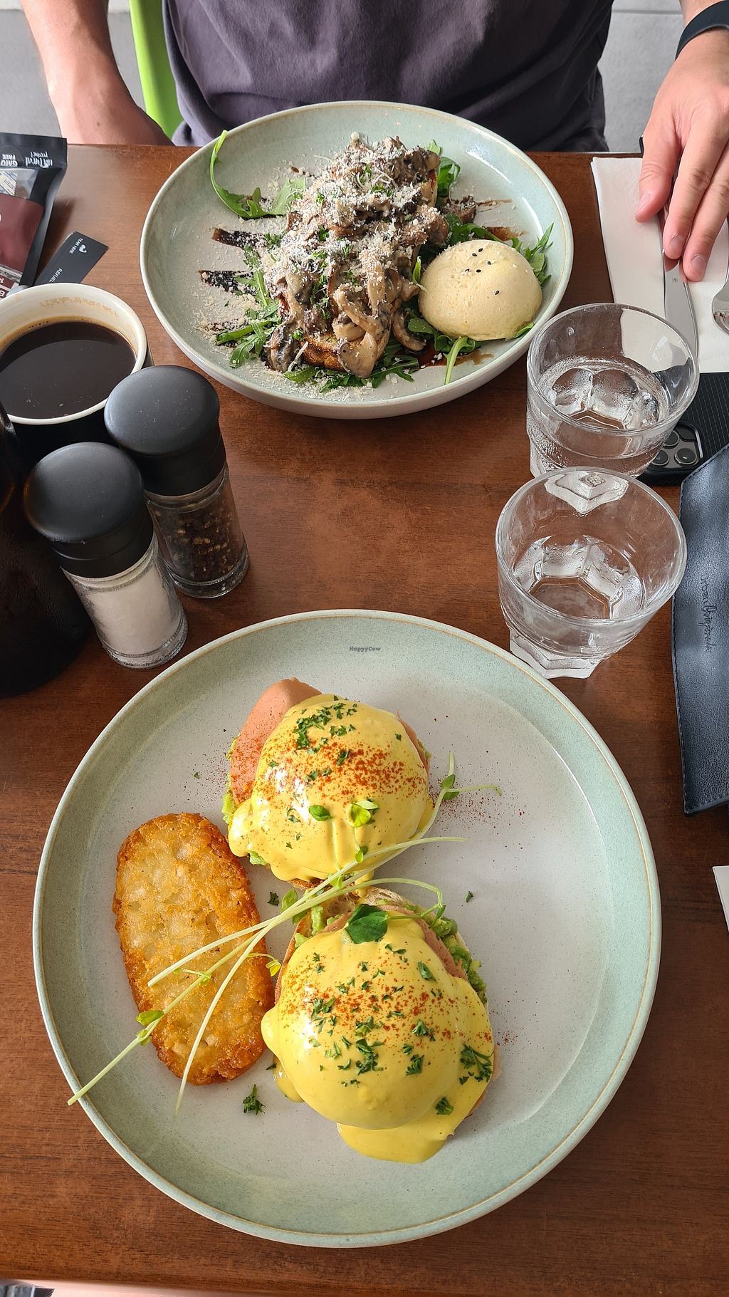 Menu full of vegan versions of non vegan classics like egg and bacon muffin and eggs Benedict. I got the eggs benedict, I absolutely loved the concept, probably didn't taste how I remember eggs to taste, but was still yummy! Partner got the creamy Mushroom which was delicious. Store is attached to a grocery store which has one of the widest vegan product selections I've seen