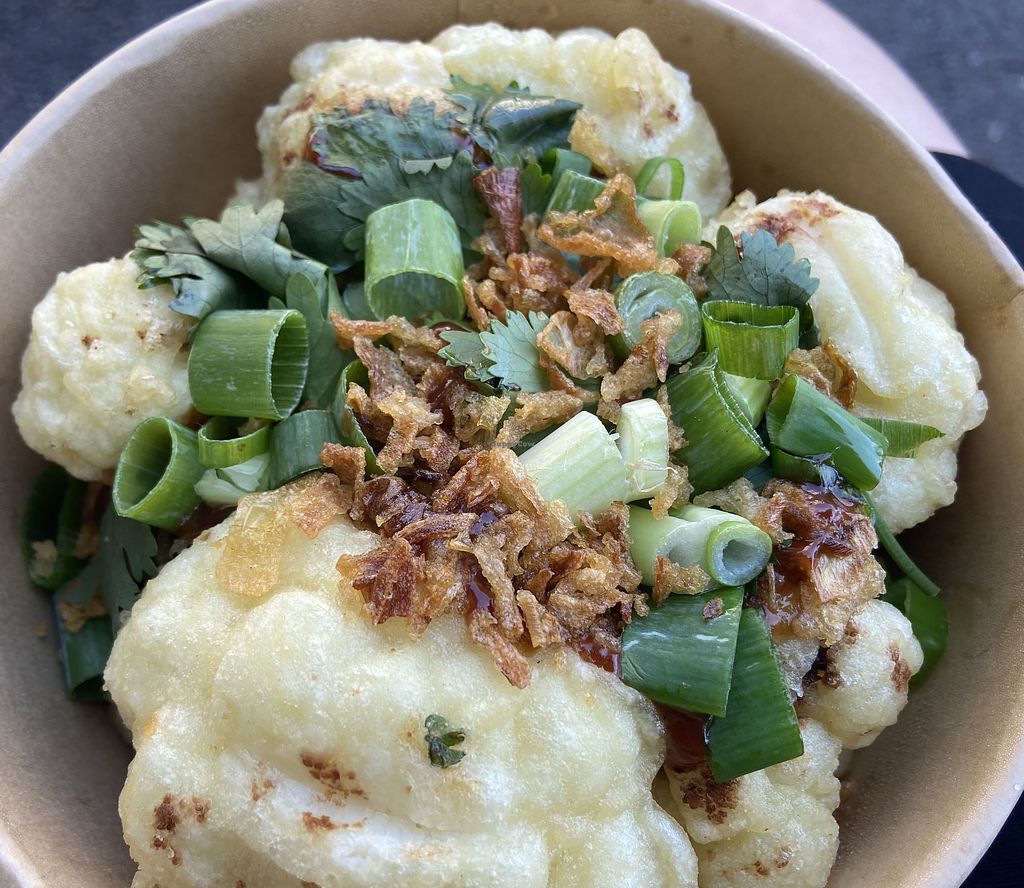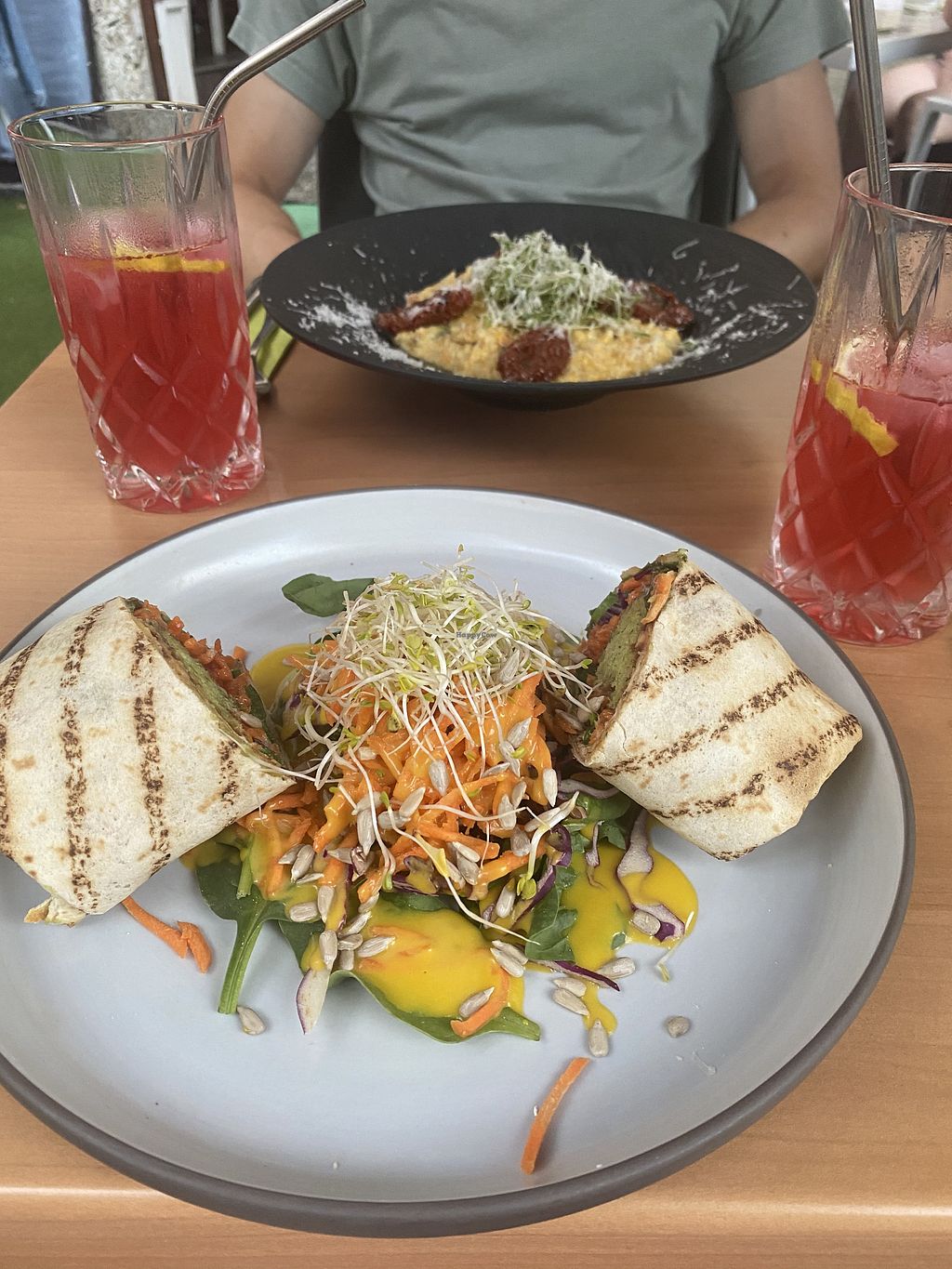 Matcha ginger iced tea, red berry iced tea, and a local beer