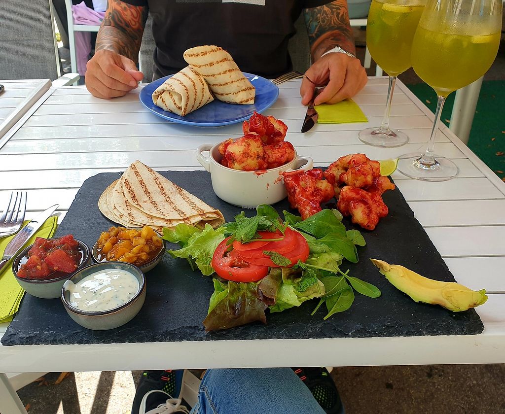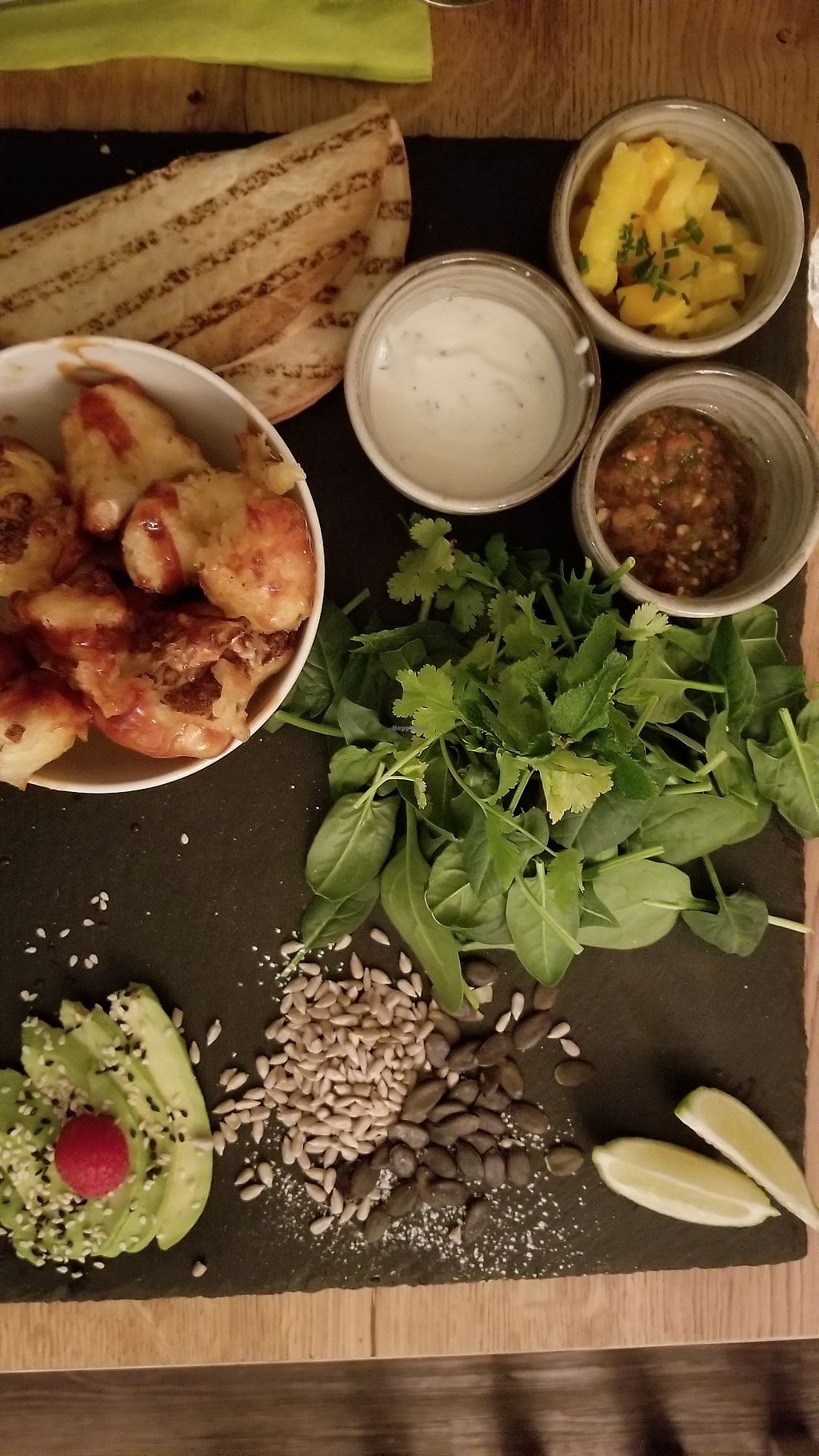 Vegan brunch platter with french toast, banana bread, avocado, hummus,…