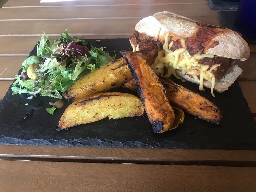 Vegan “meatball” sub. Homemade wedges and side salad. Amazing!