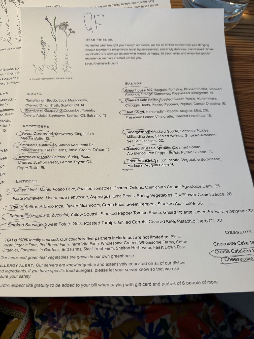 The Green House did not disappoint for my birthday dinner last week. The food was amazing and I was pleasantly surprised at their extensive menu of non-alcoholic spirits, mocktails, and a couple of NA wines. I got to try NA bourbon (Kentucky 75) and it was great as well as the NA chardonnay. (And my husband enjoyed their great selection of alcohol bourbon too.) We tried several dishes, but the standouts for me were the smorgasbord, tortellini soup, and the most delicious cornbread! The cornbread was so good we got a second order to take home. We also LOVED their desserts. The crema catalana (like creme brule) was fabulous. The apple cheesecake was also wonderful. Service was also fast and friendly.