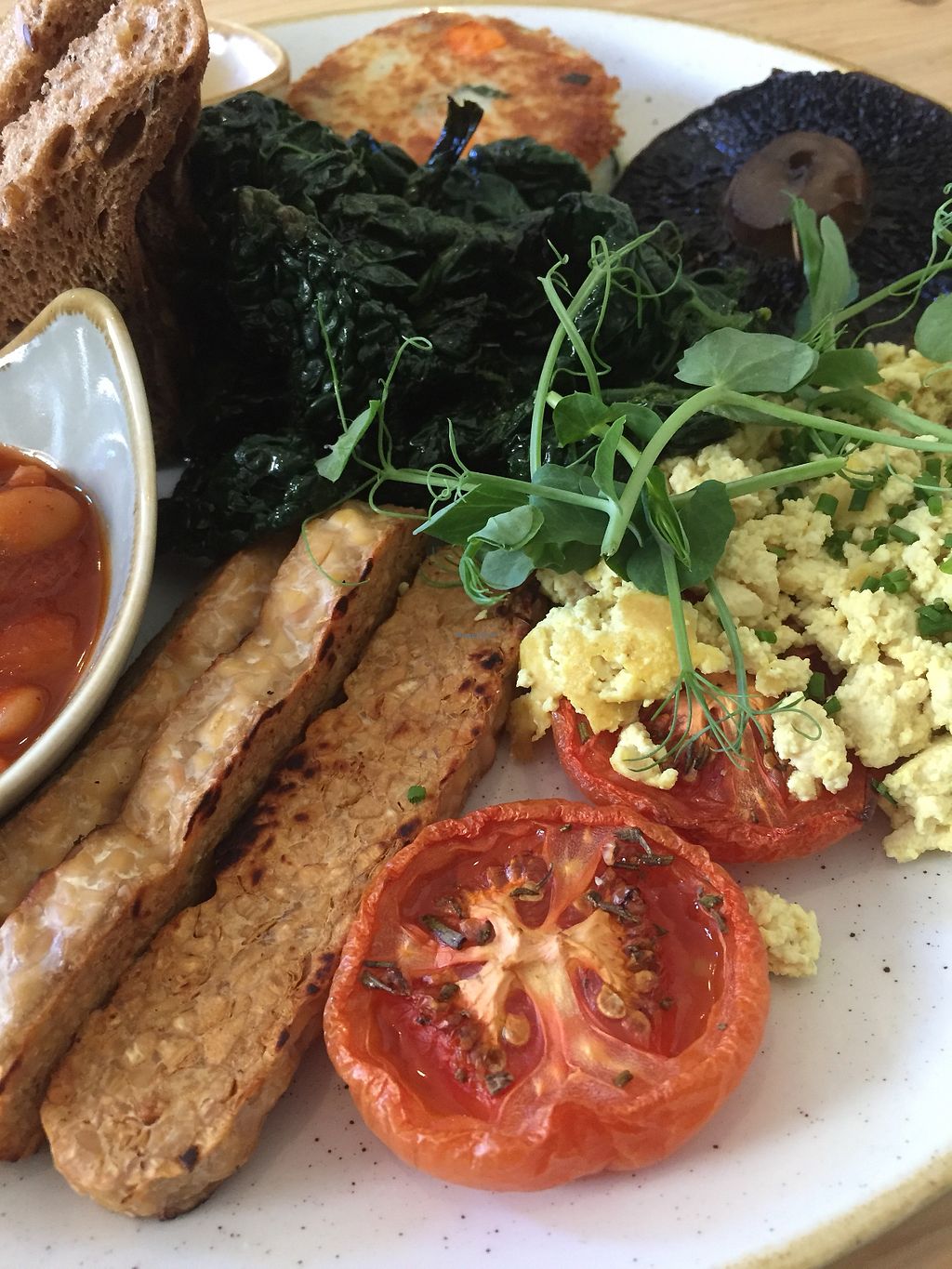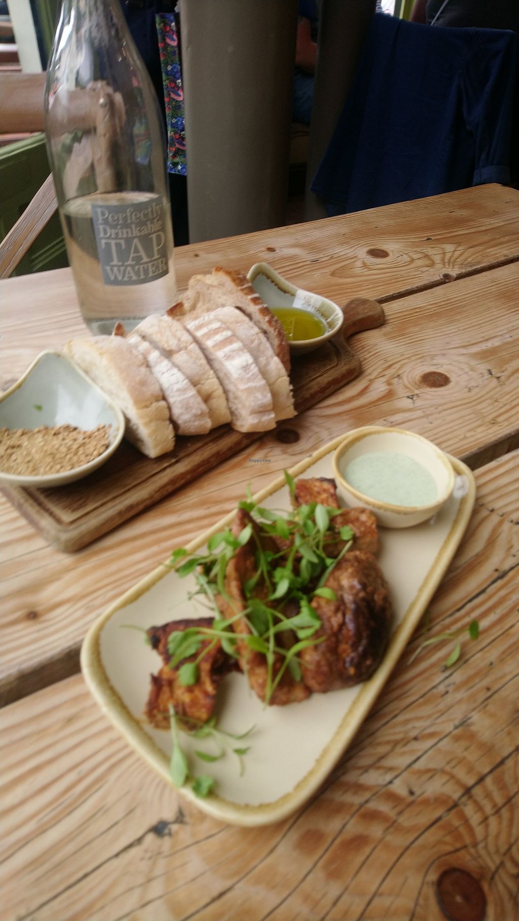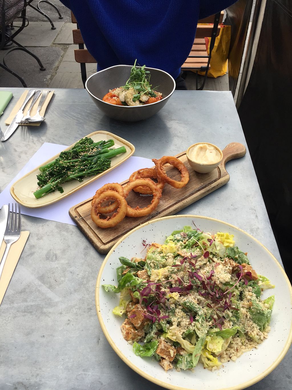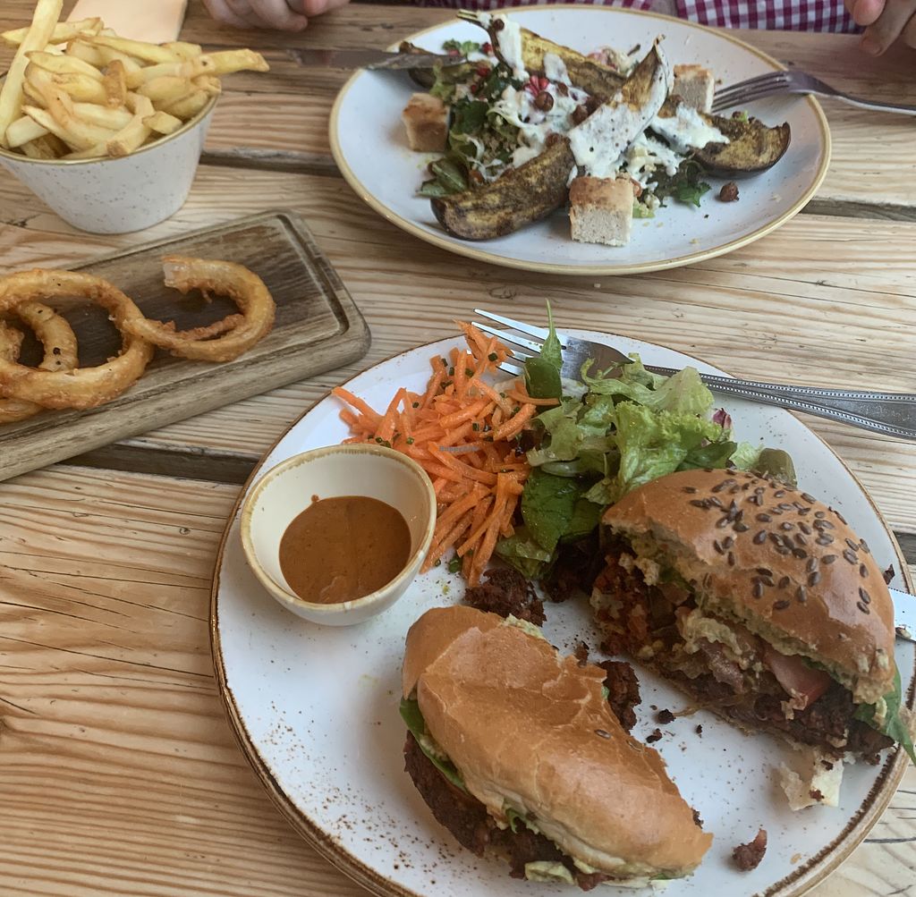 Gorgeous mushroom burgers, onion rings with vegan mayo, rosemary chips…