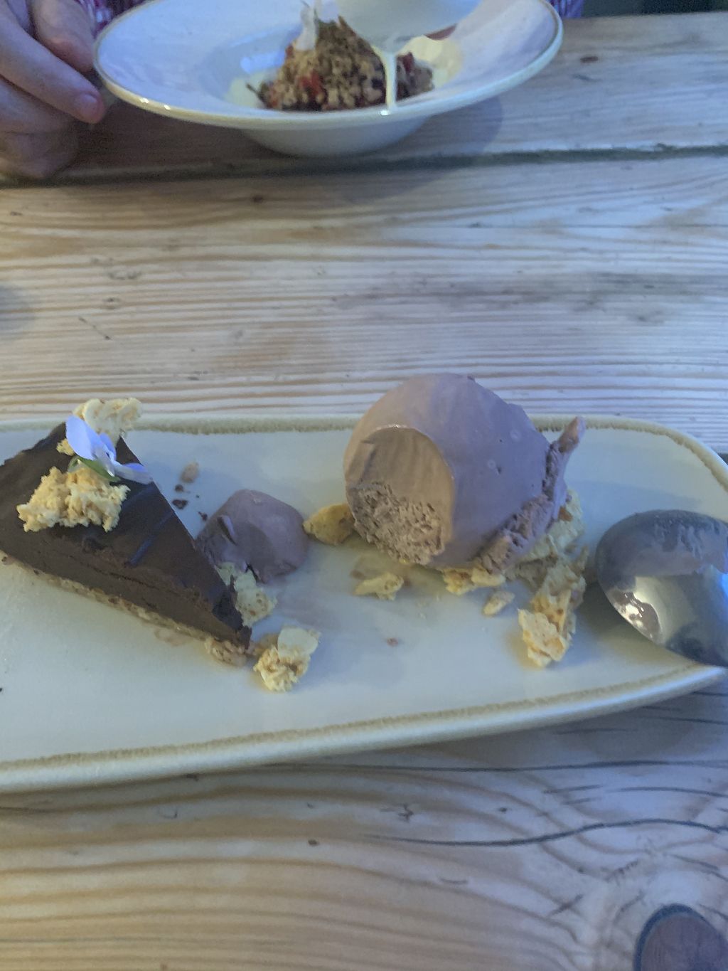 Mocha torte and ice cream and fruit crumble with lavender. Yum!