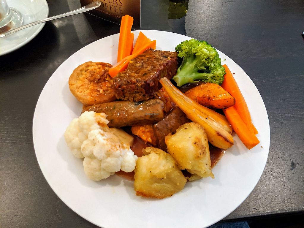 Middlesborough. Home of the Parmo. The Green Room. Home of the Vegan Parmo! Next time I'm definitely going to try one, but today I had a typical British favourite of pie, peas and mash. Their selection of pies is astonishing, I went for the Rendang curry one. It came with a lovely fluffy mash, semi mushy peas and loads of home made gravy. Oh, how I loved the gravy. We also had one of today's house specials of the BLT sandwich served with salad and lots of lovely chips. With drinks and a piece of cake to take back home there was still change out of a £20 note. The evening menu looks very special indeed and it is our aim to try this at a suitable opportunity in the near future. There's a veggie 'Hall of Fame' on the way to the toilets and a nice selection of gins. What's not to like? What's not to love? One of the nicest vegan places I've been to in the UK. I don't say things like this lightly.