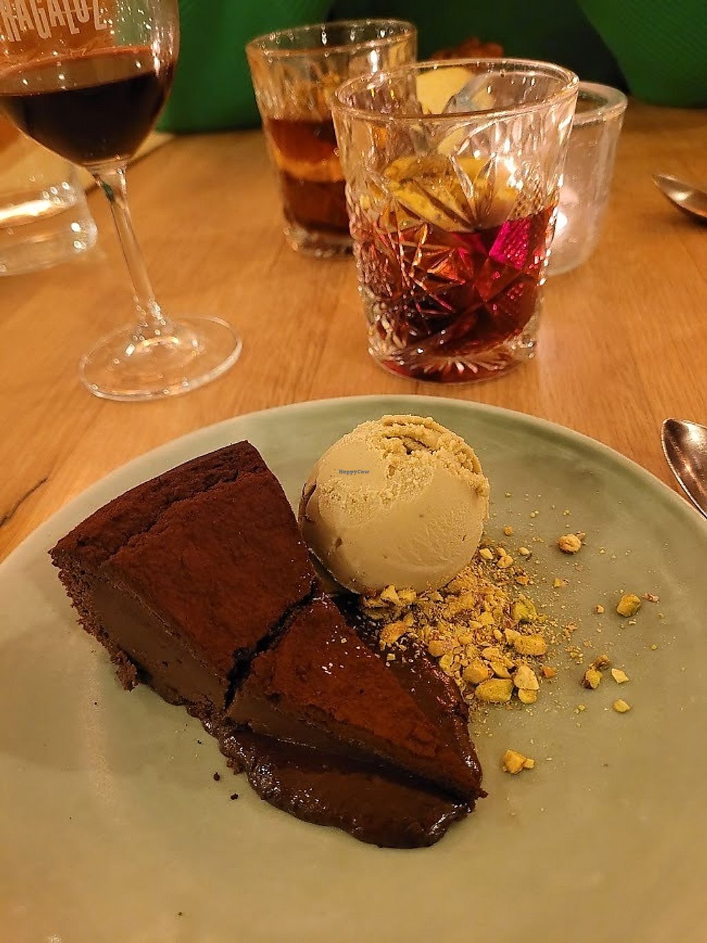 We finished with the Chocolate cake with homemade vegan pistachio ice cream, which was so wonderful. We've never tasted a vegan cake this good - almost like a molten chocolate cake with amazing ice cream and chopped pistachio as a garnish.
