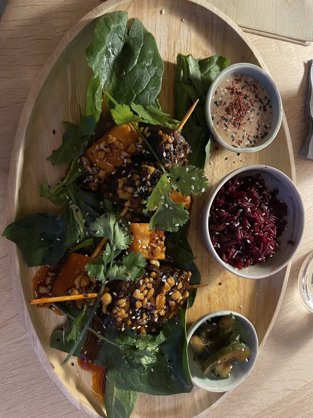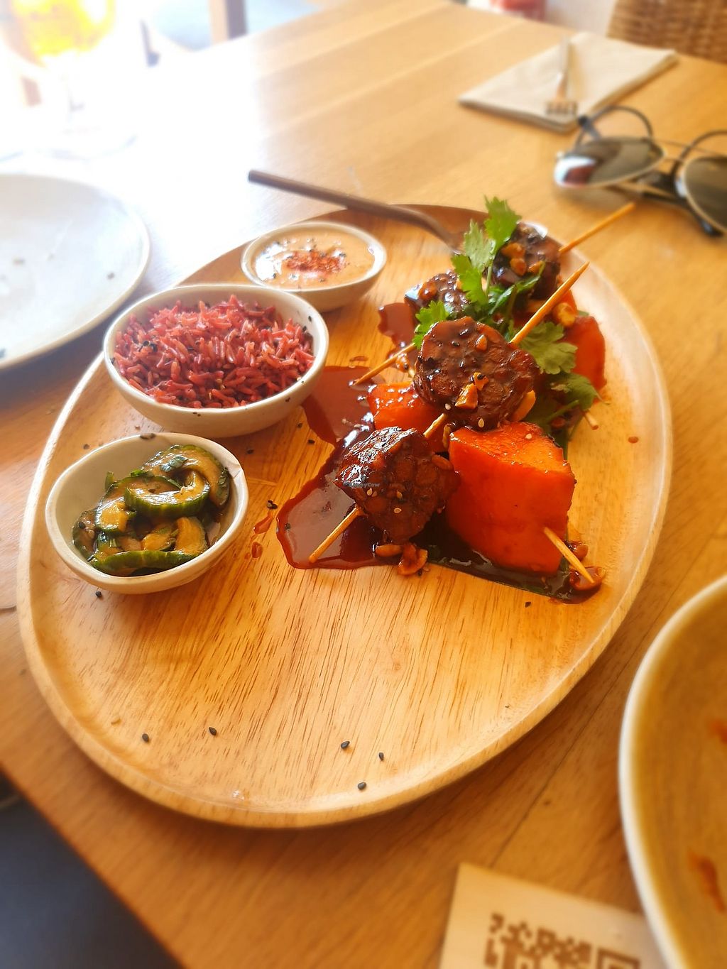 We also had the Homemade organic tempeh with papaya, basmati rice, marinated cucumber and peanut sauce. The chunks of tempeh were on skewers with barbecue sauce. What an incredible dish - highly recommended. Note that the barbecue sauce is very salty but makes the taste unique.