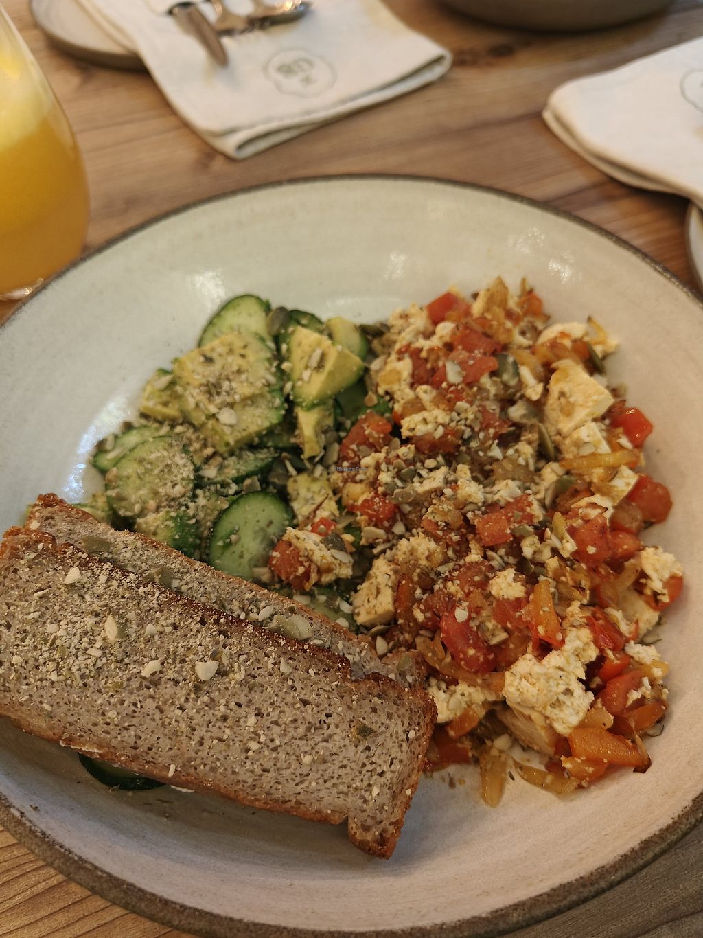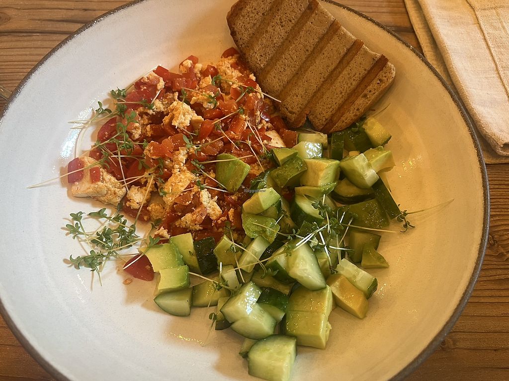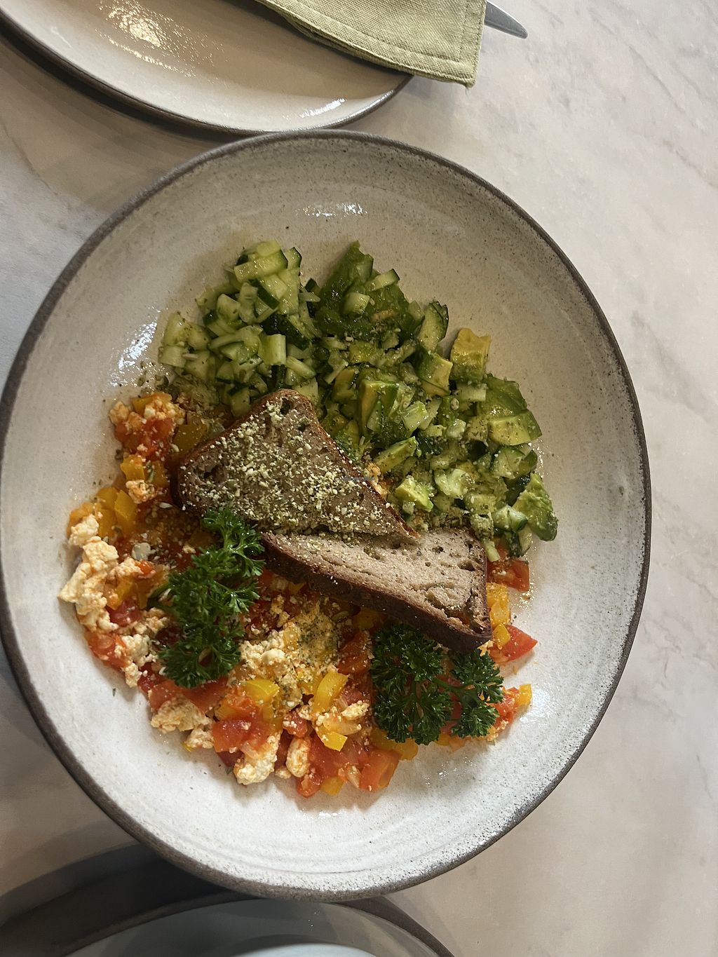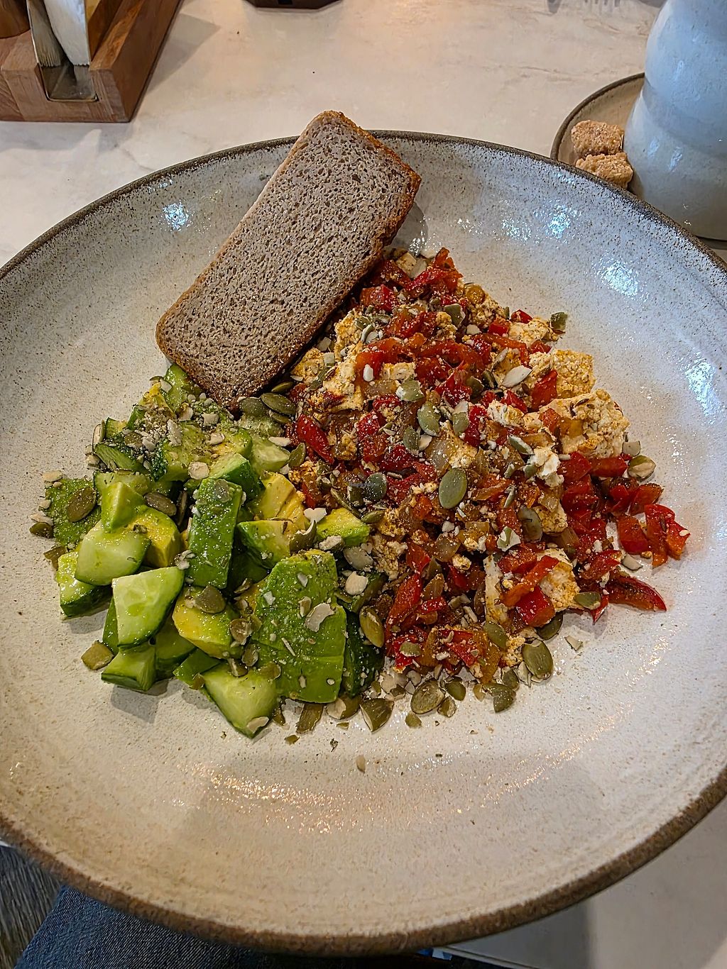 Tofu tomato scramble, diced avocado and cucumber salad with whole grai…