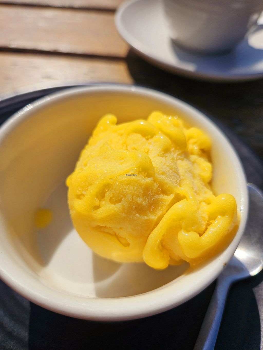 We had delicious vegan mango sorbet and vegan milk with our coffee. Beautiful view of the sea, delicious beer and the menu also offered food.