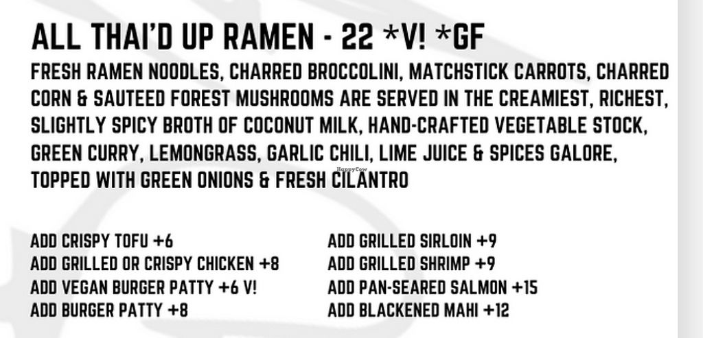 Good food. Friendly atmosphere. I had the vegan smash burger with black beans option. There was also Umami Bomb and All Thai’d Up Ramen Vegan options. Some vegan sides available too.