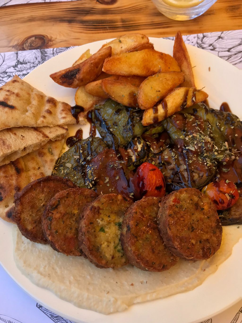 The atmosphere of this place is great and they provide service with a smile. There are a few vegan options. The beyond burger was tasty but served in pita which seemed a little strange. It was supposed to come with lettuce , tomato , onion and vegan mayo but when it arrived there was no onion or mayo which was disappointing. The falafels on the falafel plate were tasty.