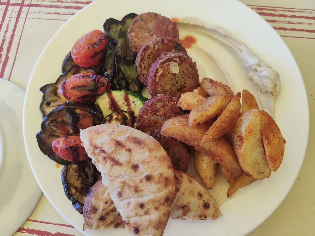 Read moreVery friedly stuff! Vegan mayo. A full plate of vegan stuff; hummus, grilled vegetables, falafel, pommes, pita.