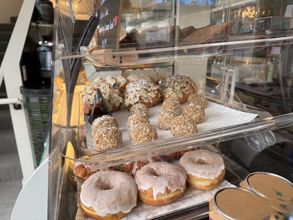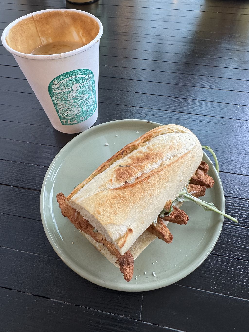 I went there after a workout, ravenous. I got a chicken ranch sandwich, a tolivefor raspberry lemon loaf and a pistachio white chocolate latte(? I think). Everything was delicious, one critique is the chickn was a LITTLE too crispy but that might just be me.