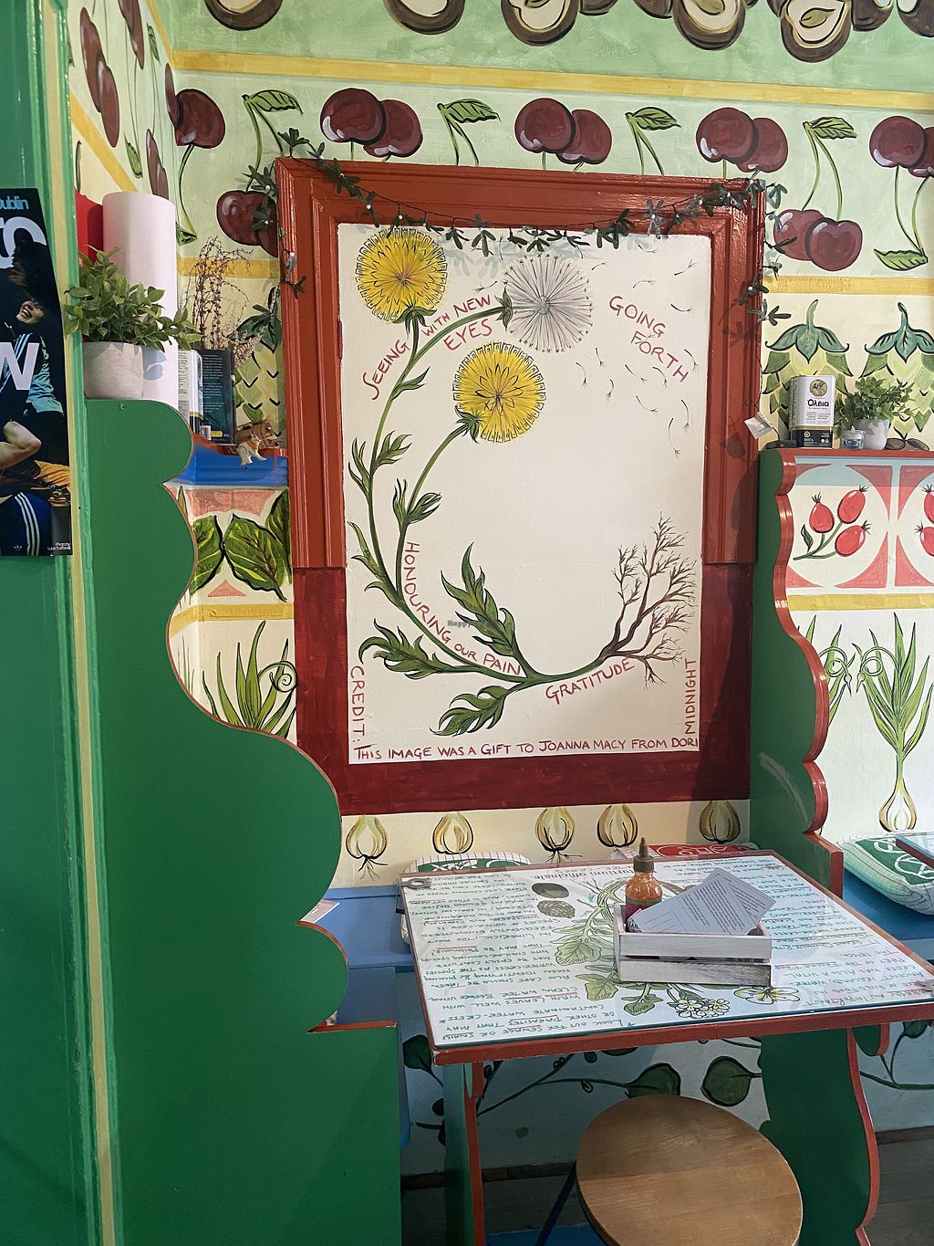 Nadine G. Dossos 2023 decoration---walls painted with borders of edible wild foods around Limerick--copious delicious bowl I had--broccoli salad, buckwheat and veggie currie