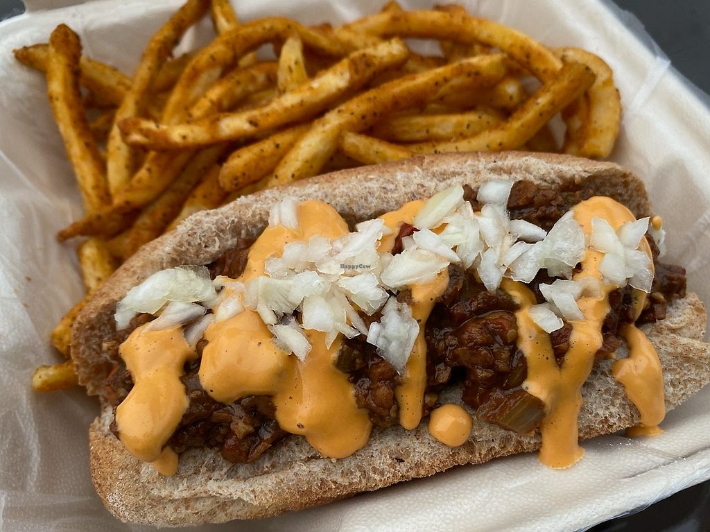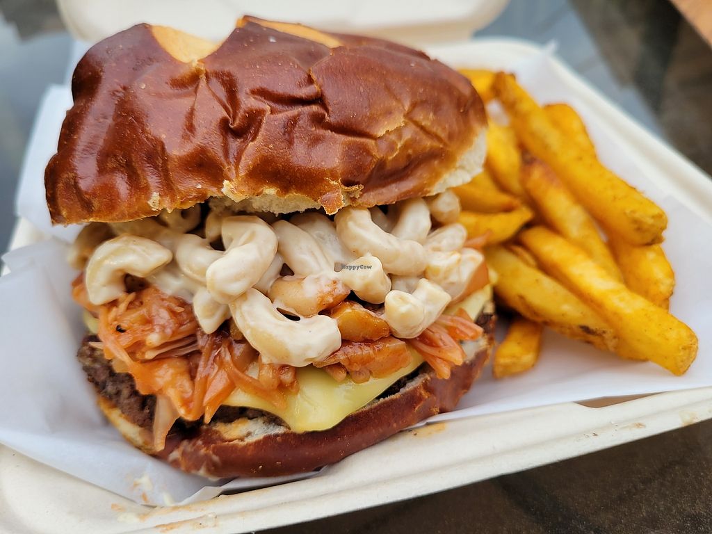 This food truck is all vegan. My friend got the double stack and I enjoyed the picnic burger. Both served with hot french fries. Mine was made with a homemade white bean burger, fake bacon, vegan cheese, and coleslaw. So tasty! The mmm muffin with cream cheese frosting was the perfect desert 🧁