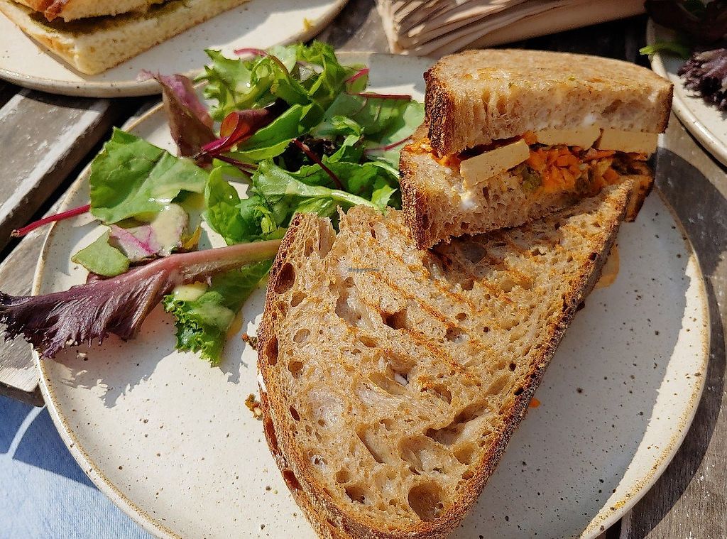 Kimchi tofu roasted sandwich and oat flat white