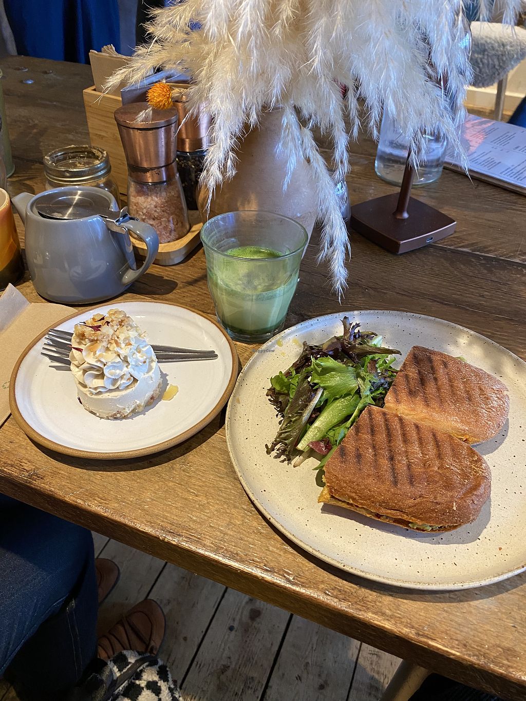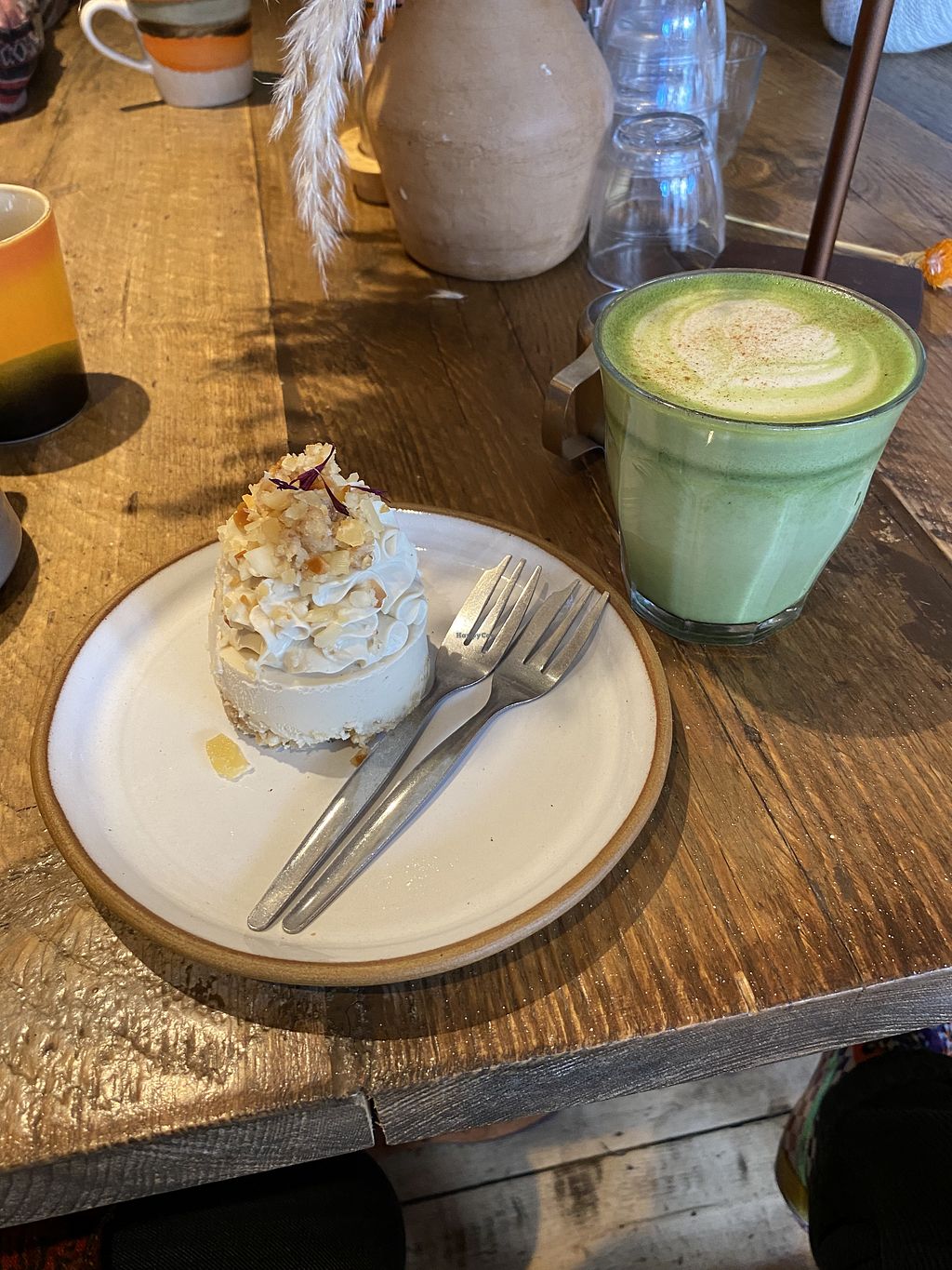 Rose & pistachio cheesecake, Matcha latte 💚