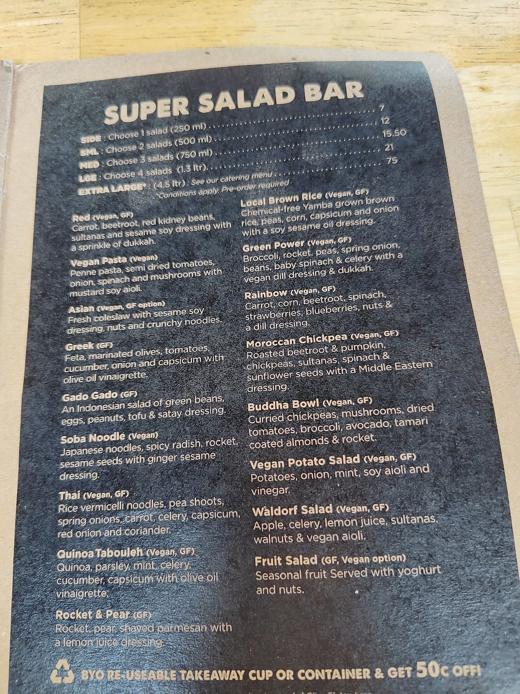 (Oct 2023) $14.50 for a "medium" (3 salad) bowl. The servings were huge. Would just have light brekky at hotel, late lunch here and not need dinner. Salad bar had a lot of vegan options, enjoyed mixing and matching different combos. Has cakes/treats, not many vegan. The "yum balls" are massive and yummo.