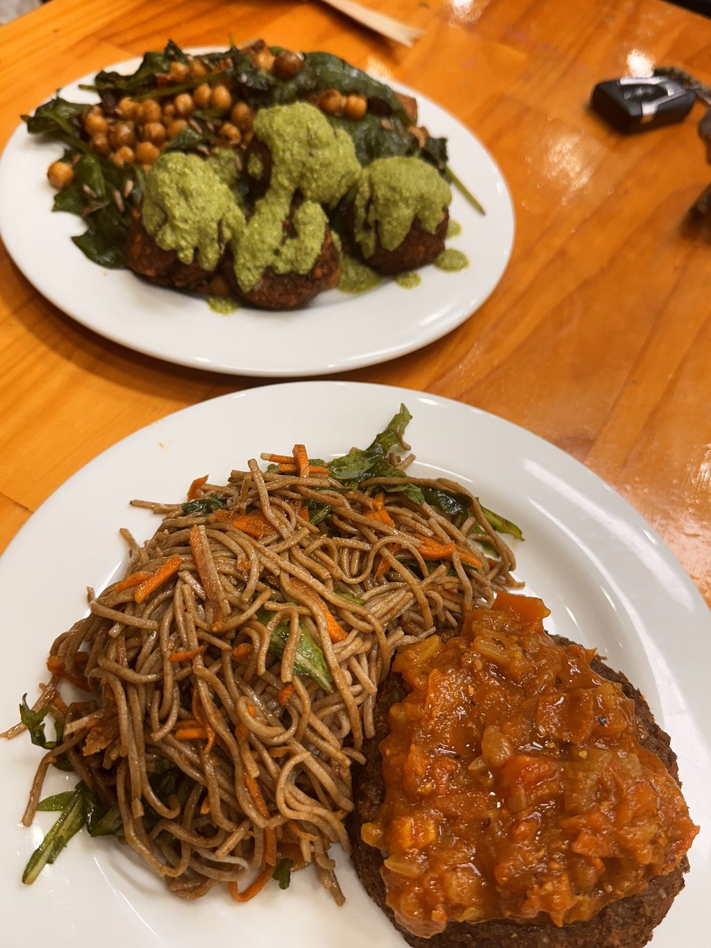 Stopped here had a few salads soba and rainbow my husband had bean tacos it was fresh but kind of bland. I asked for satay sauce on the side. It filled us up and it was good but not amazing. The grocery shop is cute I got a jar meal to take away.