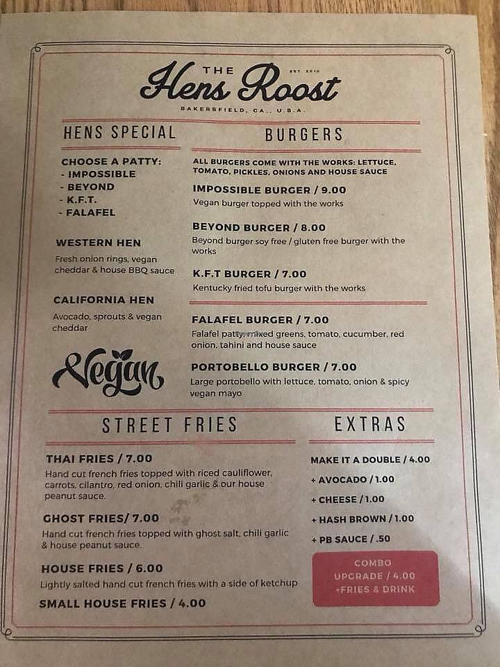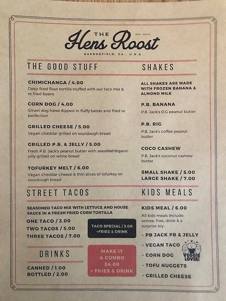 The Hens Roost is great for quick and delicious grab and go food as well as a intimate quirky place to sit down and eat. Love the food I get here every time. Menu has a diverse amount of comfort food options and the specials only add to it. Highly recommend their Thai style dishes and corn dogs! The staff is always kind, patient, and happy to chat about all things vegan. Always impressed with the Hens Roost.