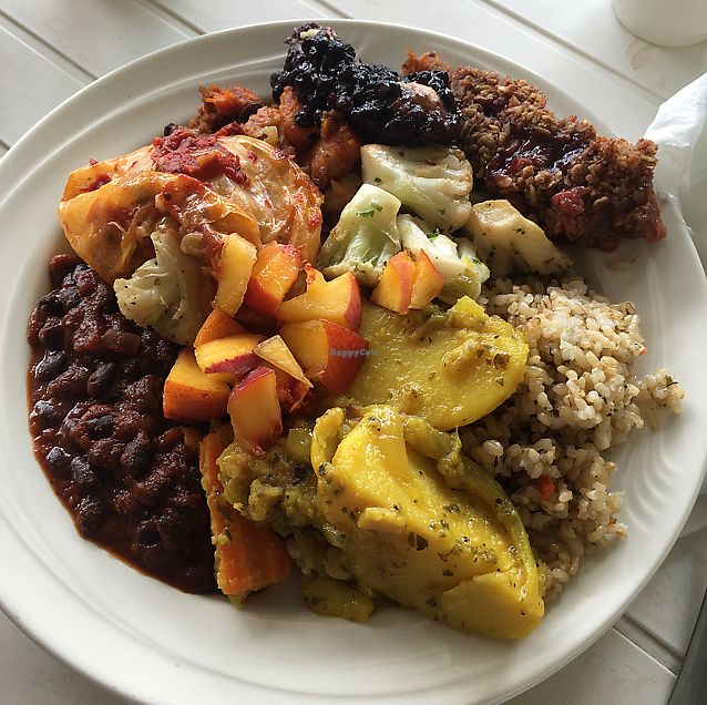 Vegan baked beans, rice, cabbage roll, potato salad and coleslaw. Buff…