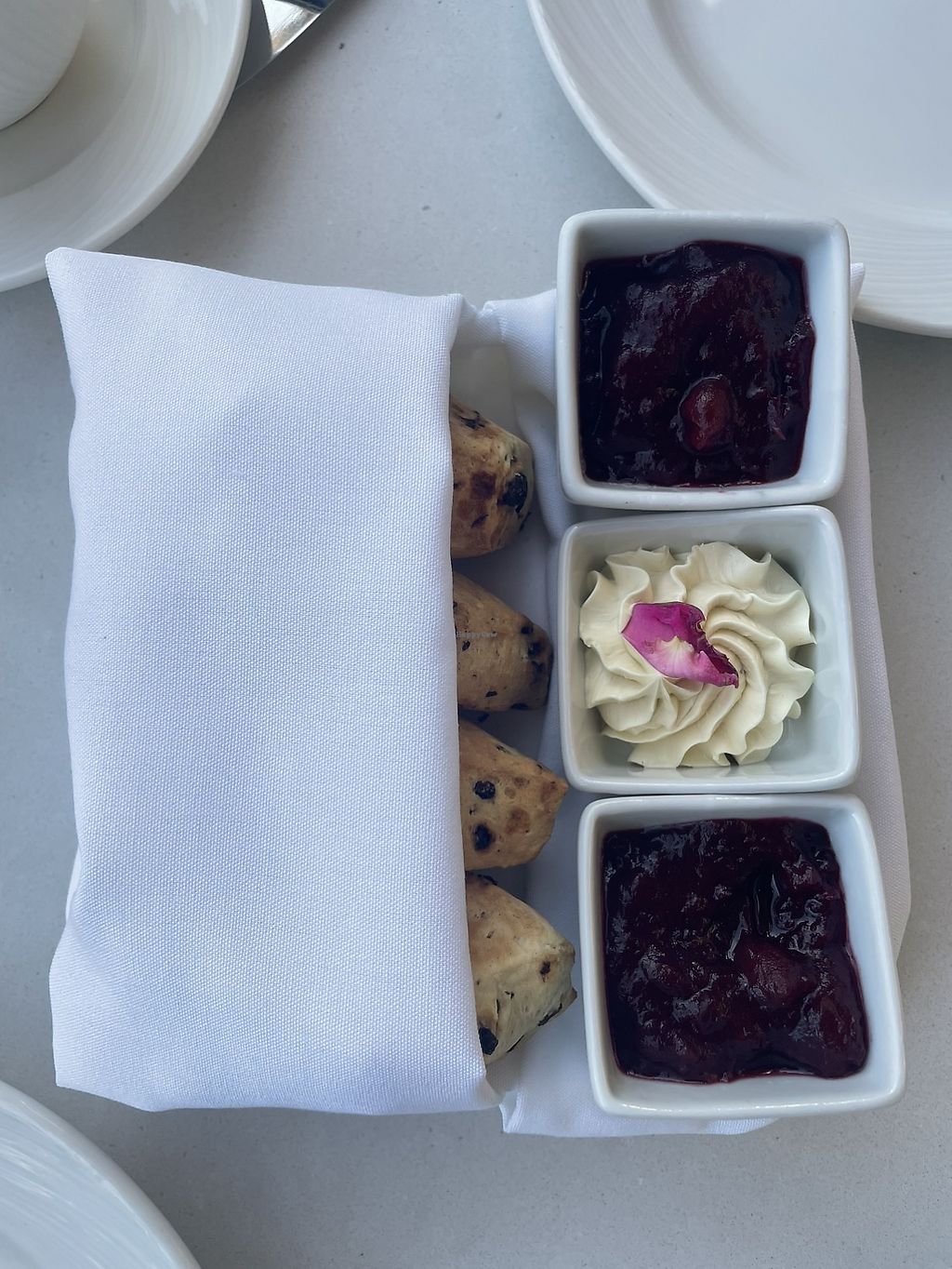 Currant scones with vegan butter and jam. Loved these.