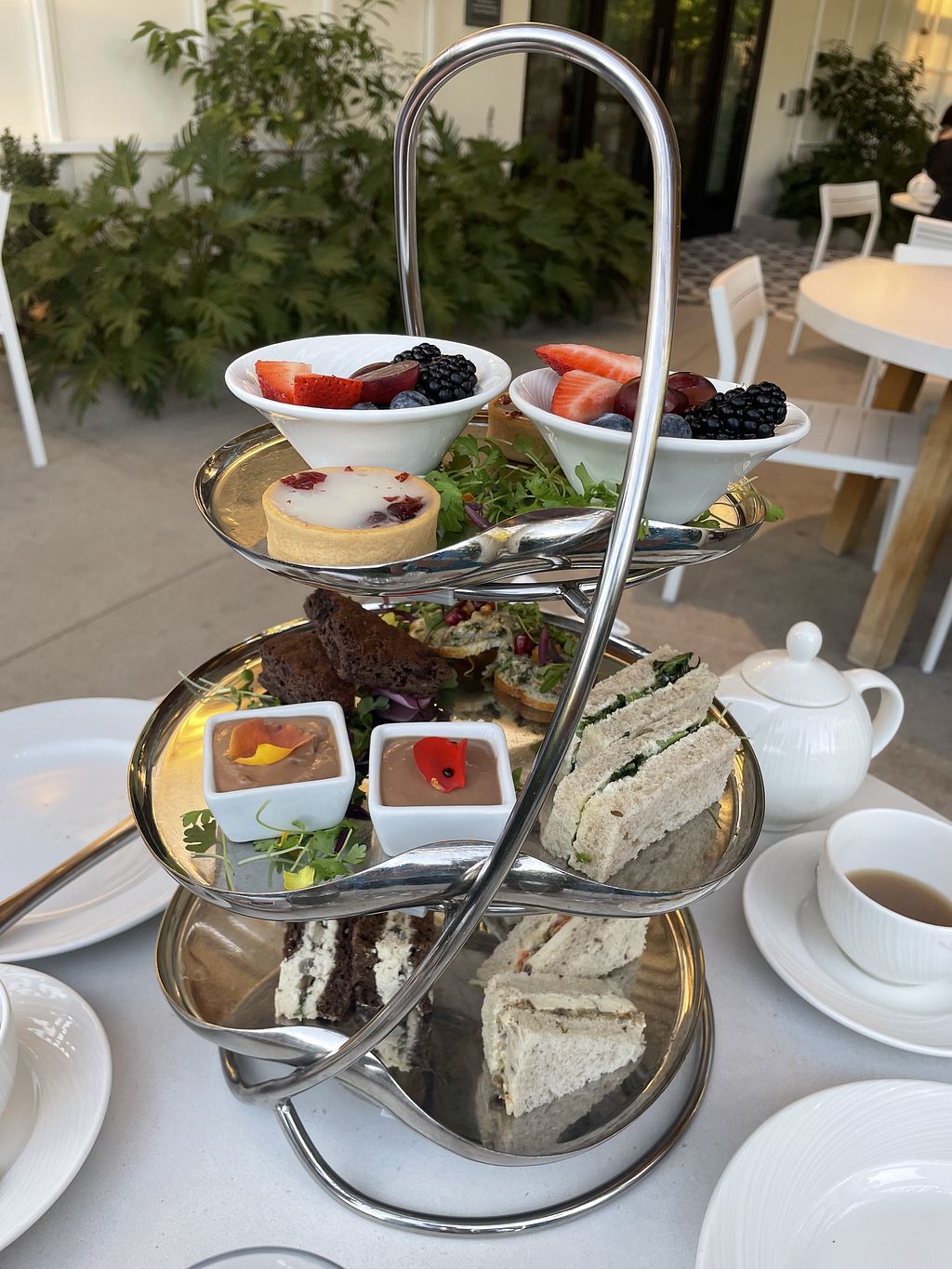 Vegan sandwiches and sweets. Top tier is white chocolate fondue.