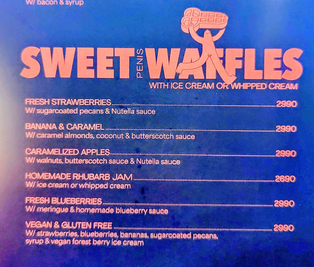 Café of the phallological ([censored]) museum in Reykjavik, popular tourist hotspot. Has vegan options for waffles and plant milks for coffee.