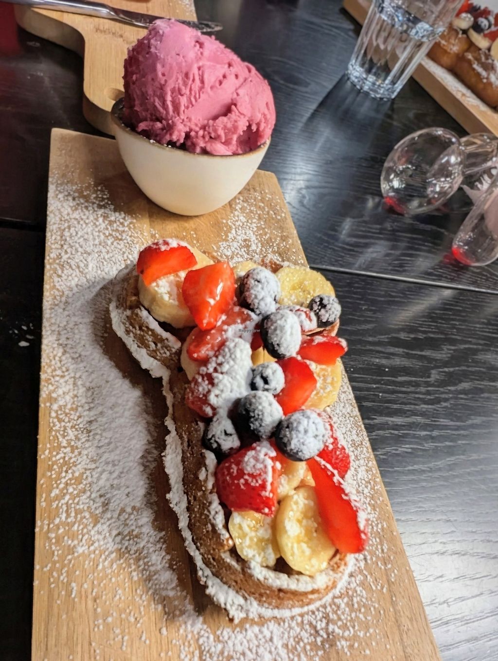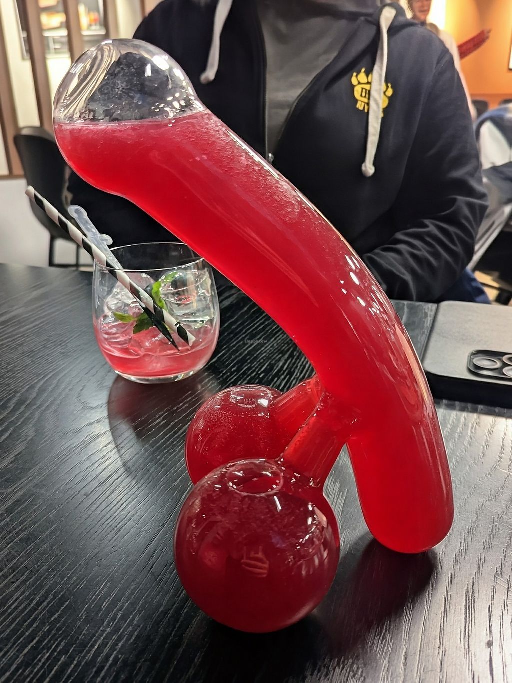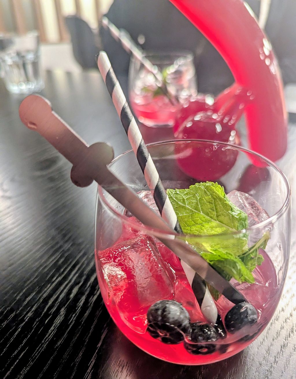 The clearly labeled vegan waffle plate was absolutely outstanding! Ours came piled high with fresh fruit, crunchy nuts, sweet syrup, and a scoop of refreshing sorbet. We couldn’t resist also sharing the blueberry mojito served in the cheeky, [censored]-shaped glass—it definitely added some laughs to an already fun experience! 🍆🧇