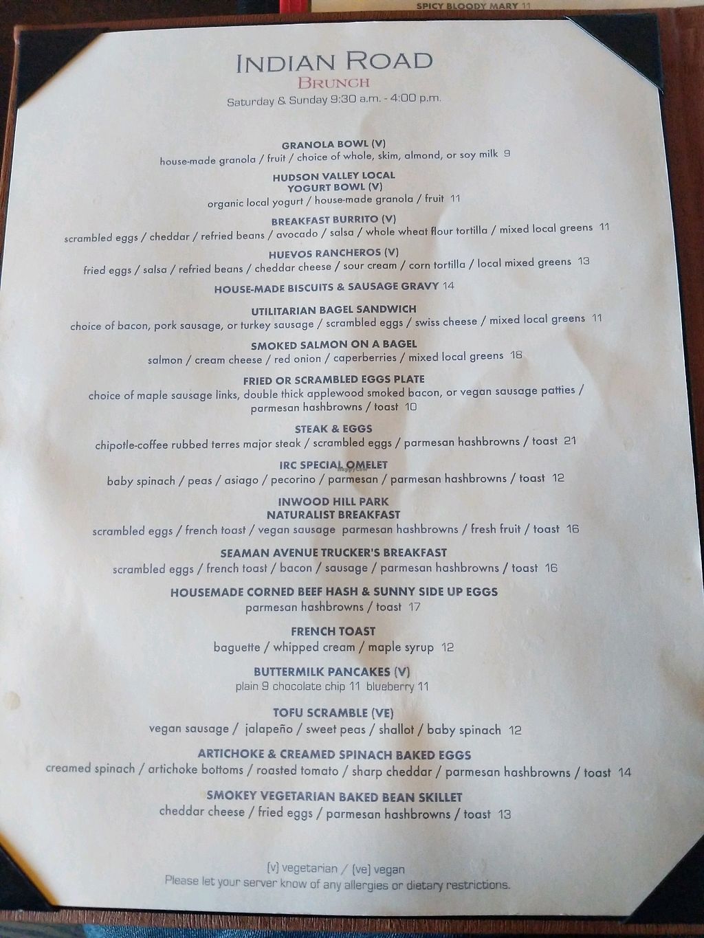At one time the restaurant at this location (Indian Road Cafe) had at least one vegan item in each category. However, the new restaurant (Inwood Farm) has fewer vegan items. Also, it has a different owner and everything, so the listing should really be replaced. But anyway...