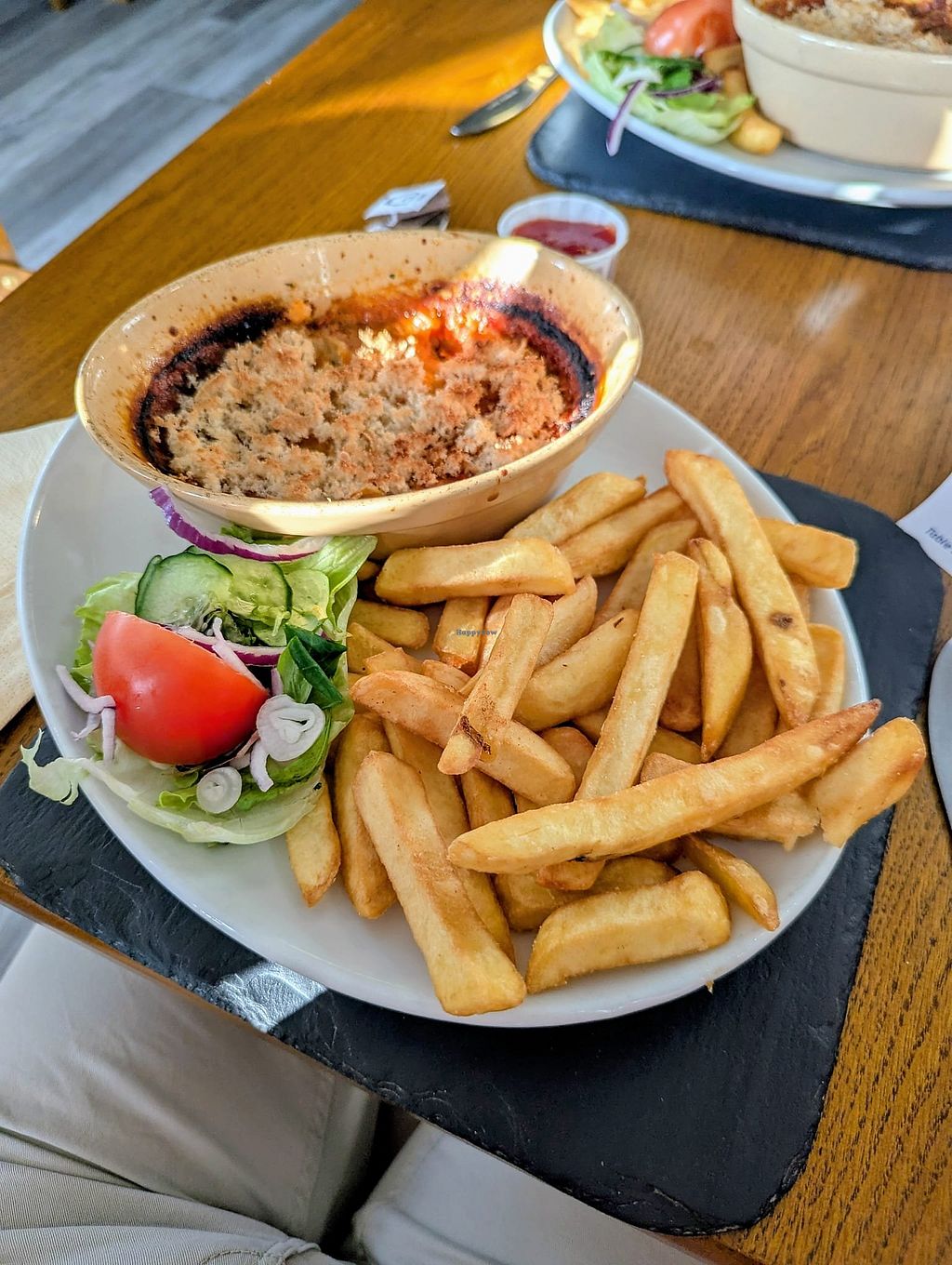 Managed to fit us in on a busy Saturday night as walk ins. We both had the vegan lasagne and chips. A good portion and tasty. They have a vegan/ veggie menu with a good selection of options. Seating inside and out with a fantastic view of the estuary. Fast service. Recommend to book ahead.