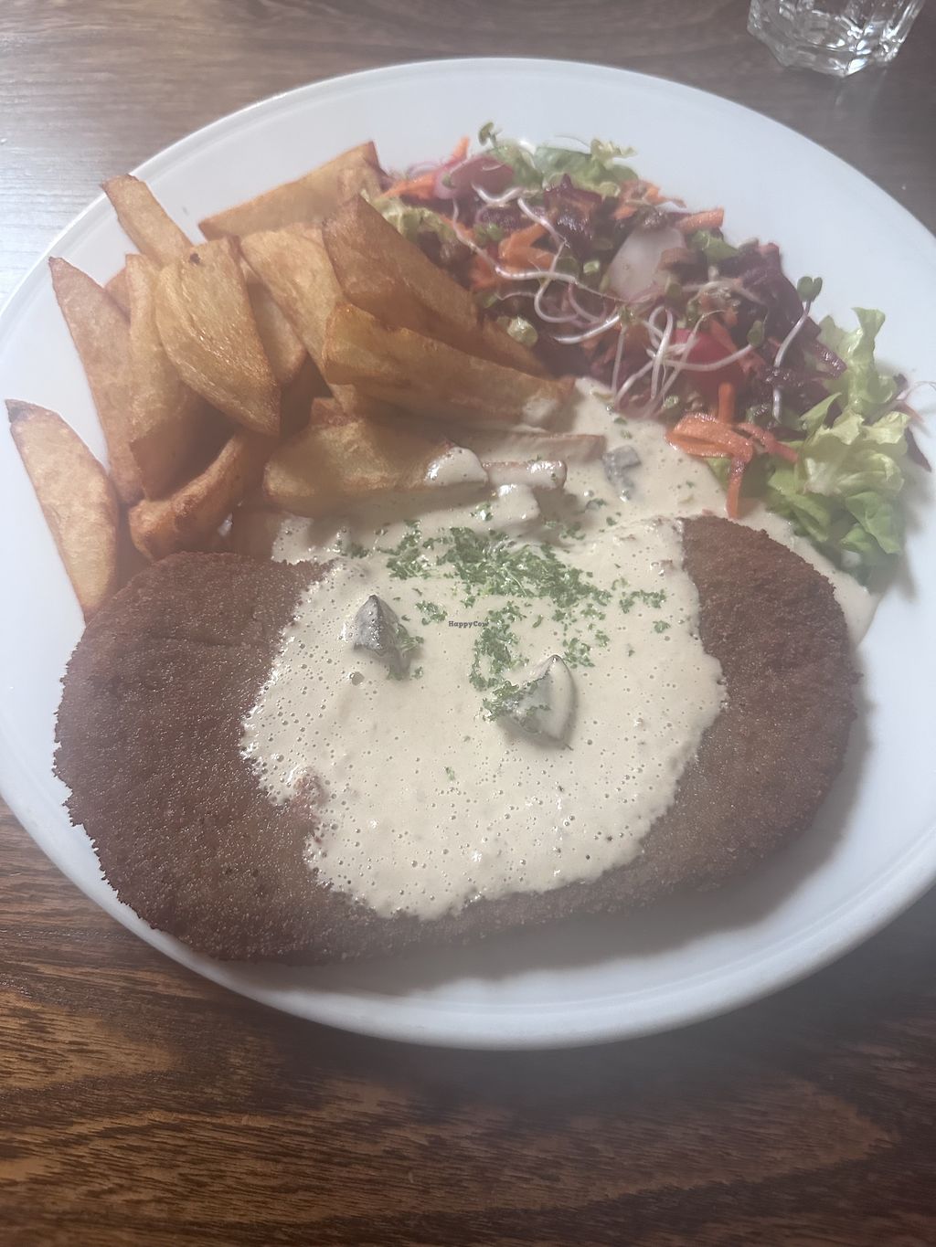 Das Schnitzel war lecker, aber für 21€ war das Gericht leider zu teuer. Es gab kaum Soße, fast keine Pilze und der Salat war kaum zu erkennen. Außerdem mussten wir über eine Stunde auf unser Essen warten und wir haben uns das Schnitzel geteilt.