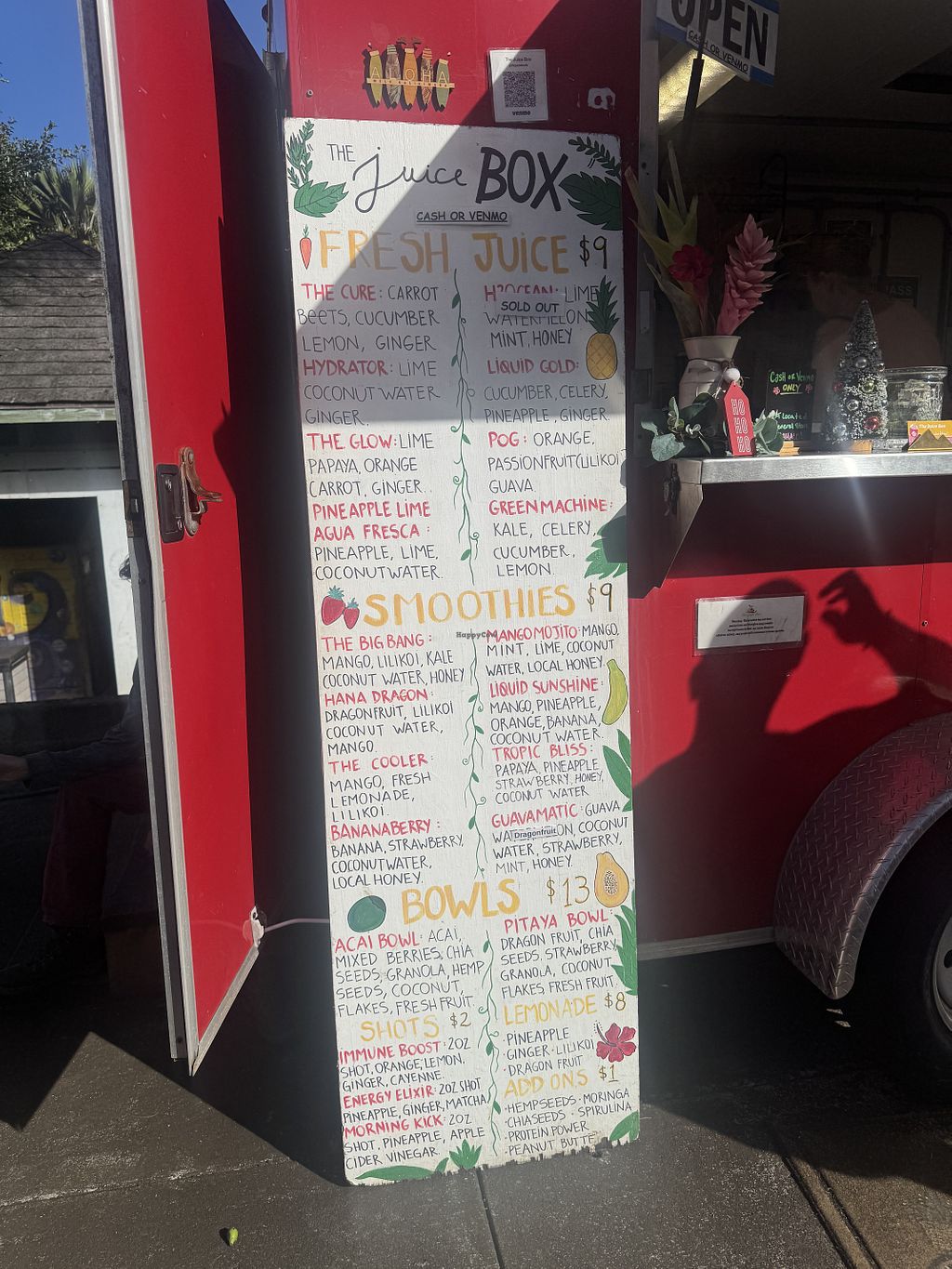 Juice and smoothie bar that offers smoothies, juices, shots, and açaí bowls. All items on the menu can be made vegan by omitting honey. Open Mon-Tue 8:00am-3:00pm, Thu-Sun 8:00am-3:00pm.