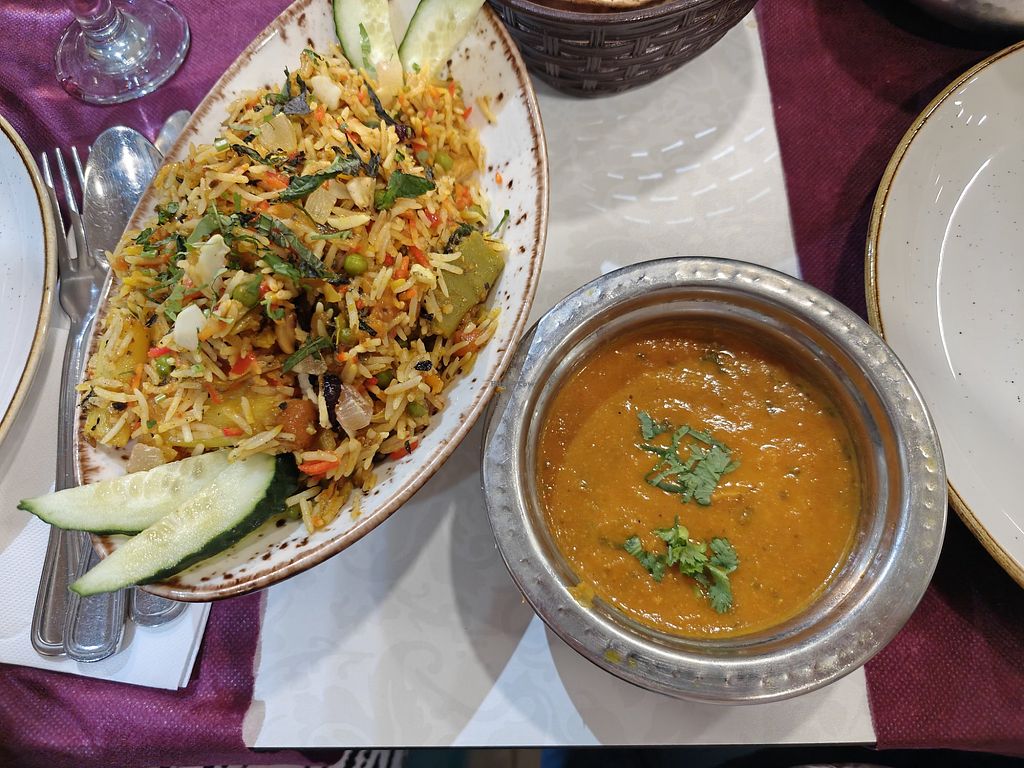 Vegan meat biryani with a lovely spicy sauce on the side and tark dahl