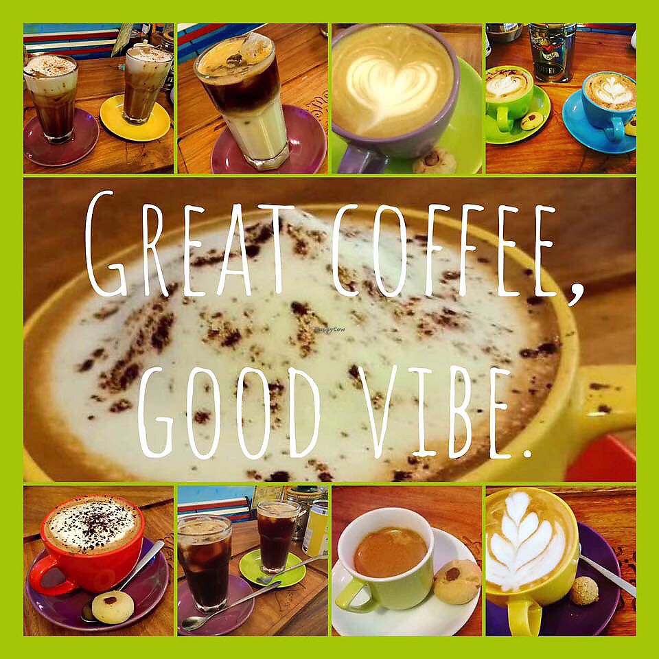 Great soy lattes, not your sickly sweet ones like Starbucks gives you. Try the calamansi cakes and baked goods. I also like the little cookies they give you with the coffee. Must also get the cheese and jalapeño panini, vegan and spicy good. Served with hummus and veggies too! Second fav is the pesto panini. Owners are super cool, chill, friendly babes too. (Plus!) Amazing service, bright colorful ambience. Check it.