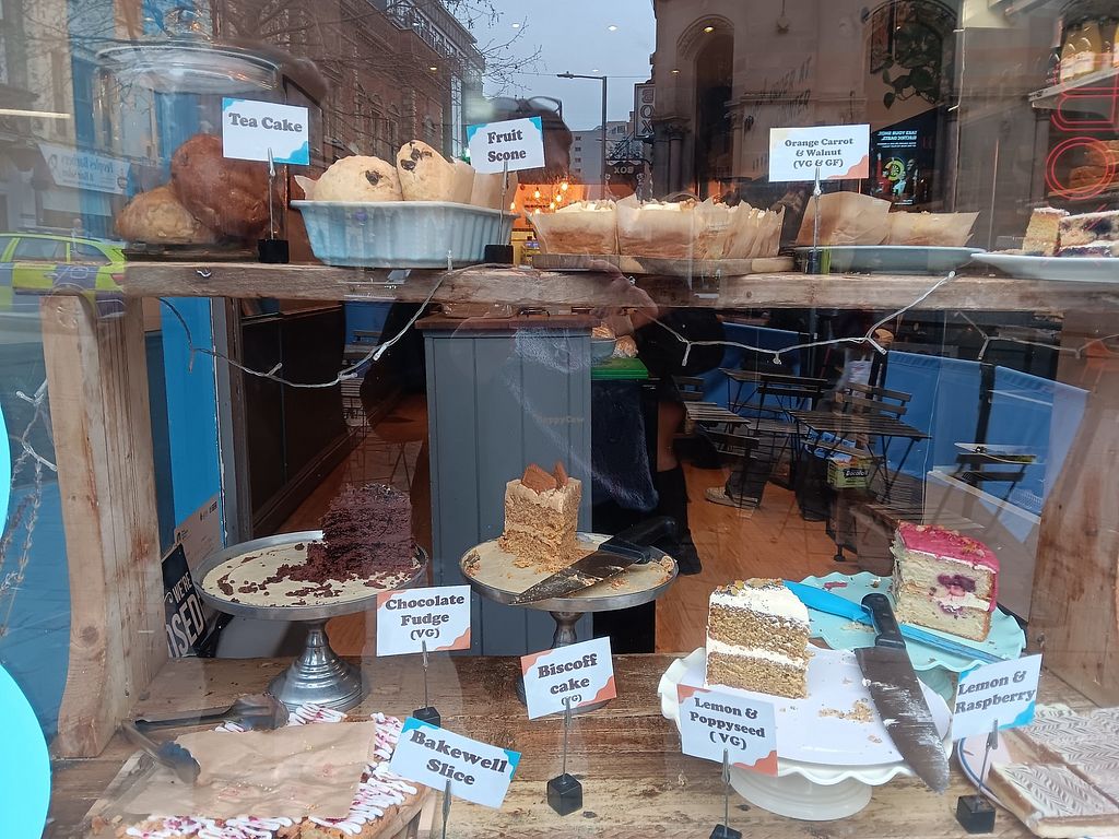 Serves meat, vegan options available. Cafe offering lunch, brunch, coffee & cake. Has vegan options for breakfast, an open wrap with beetroot falafel & sweet potato homous, and multiple varieties of vegan cakes. Reported closed September 2025.