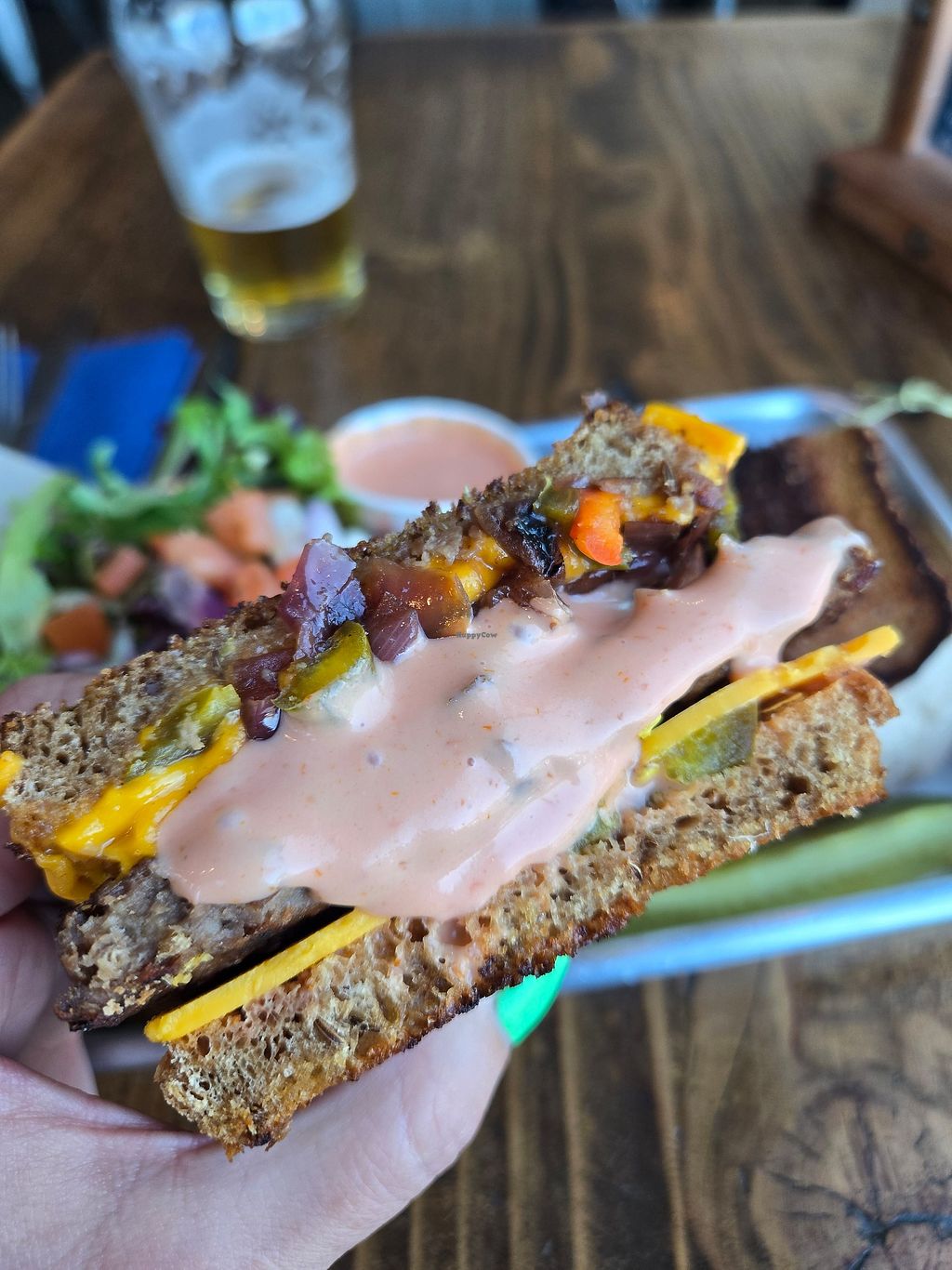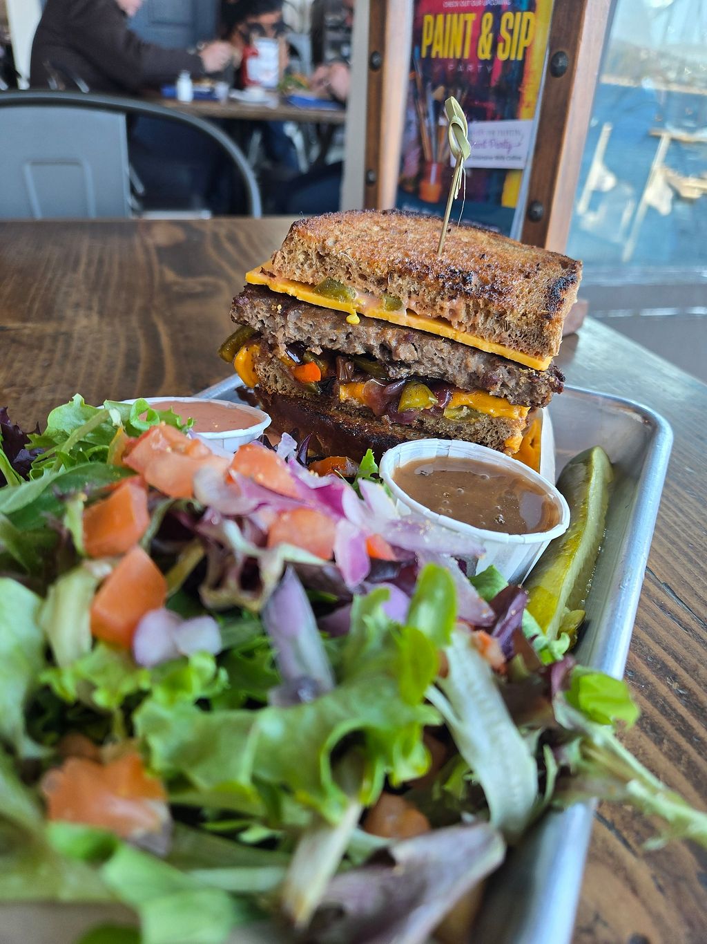 Serves meat, vegan options available. American restaurant and tap room located at Lake Arrowhead. Offers a clearly labeled vegan gyro wrap with Impossible ground "meat", as well as other items on the menu that can be made vegan, such as burgers, sandwiches and appetizers. Open Mon-Sun 11:00am-9:00pm.