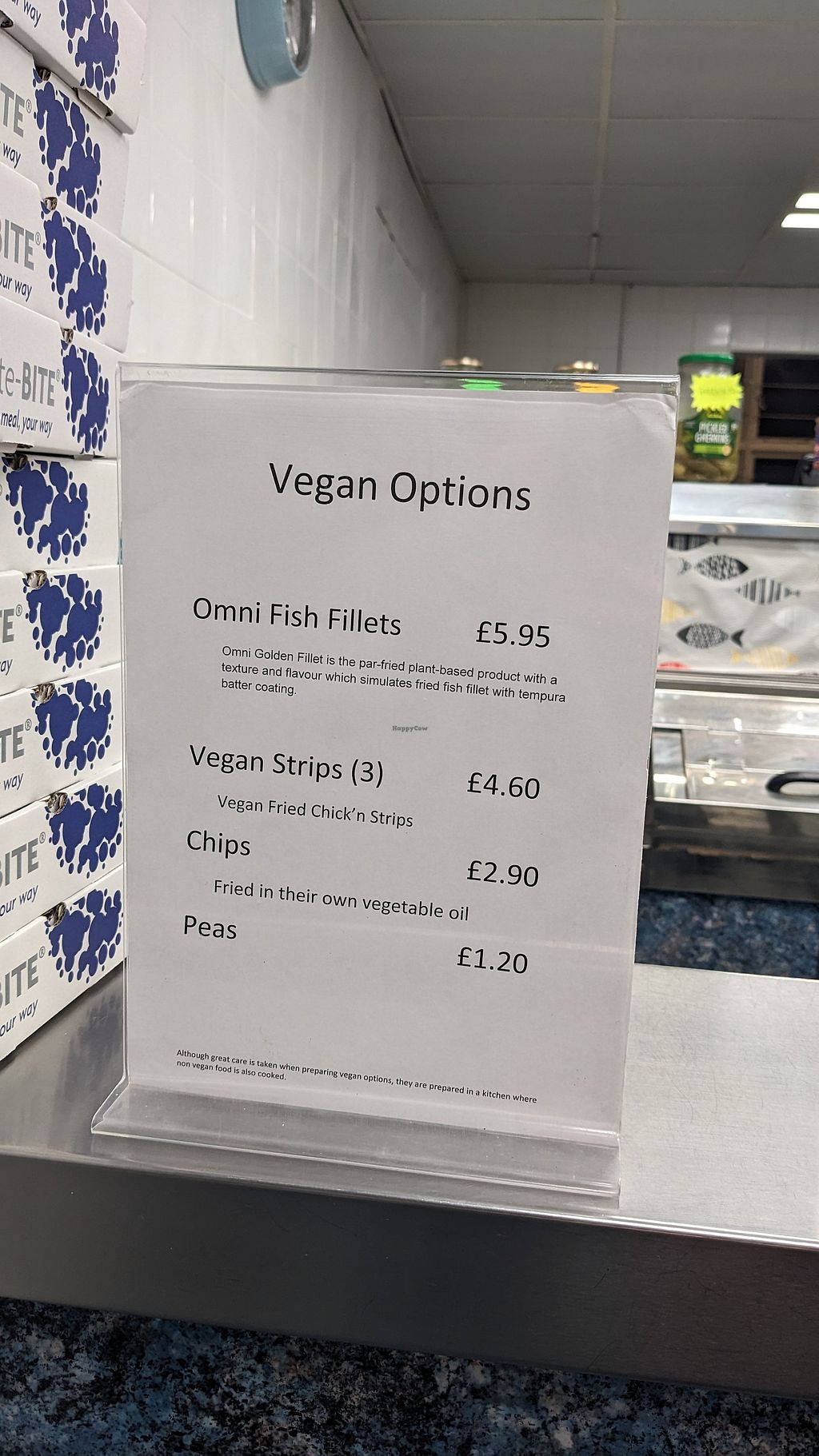 Serves meat, vegan options available. Fast food restaurant offering a vegan section with Omni fish fillets, vegan fried chicken strips, chips fried in vegetable oil, and peas. Reported closed November 2024.